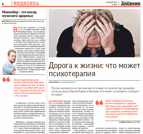 В ноябре 2019 года была организована акция для жителей Петербурга «Усабрь» (Movember), направленная на профилактику рака простаты. С 11 по 14 ноября все желающие мужчины в возрасте от 50 до 65 лет БЕСПЛАТНО могли сдать кровь на простат-специфический антиген (ПСА) в целях ранней диагностики рака простаты.