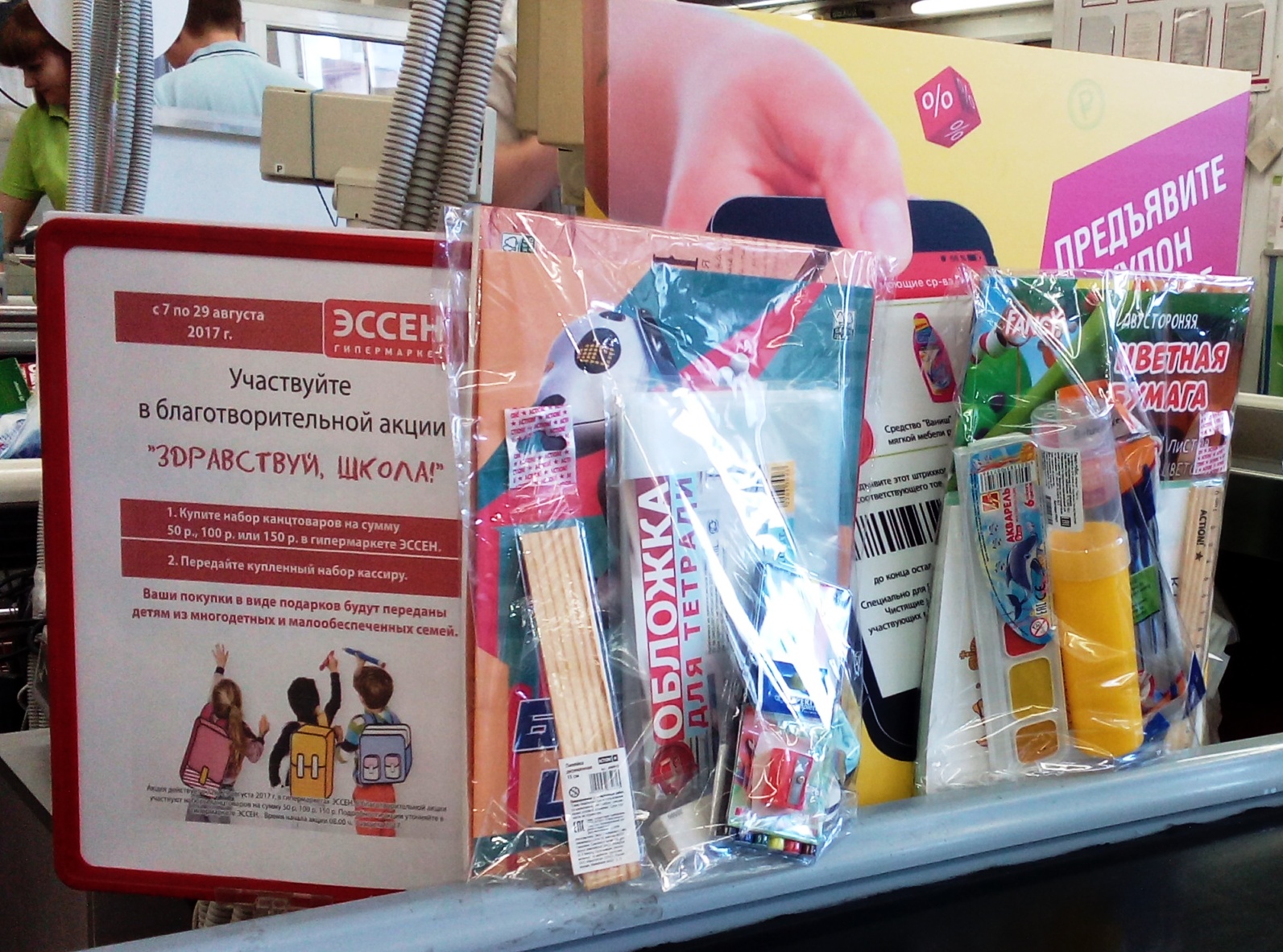 В преддверии старта акции сотрудниками Торговых центров ЭССЕН были сформированы наборы со школьными принадлежностями (ручки, карандаши, ластики, краски, альбомы, тетради, товары для творчества) в ценовой категории 50,100 и 150 рублей.