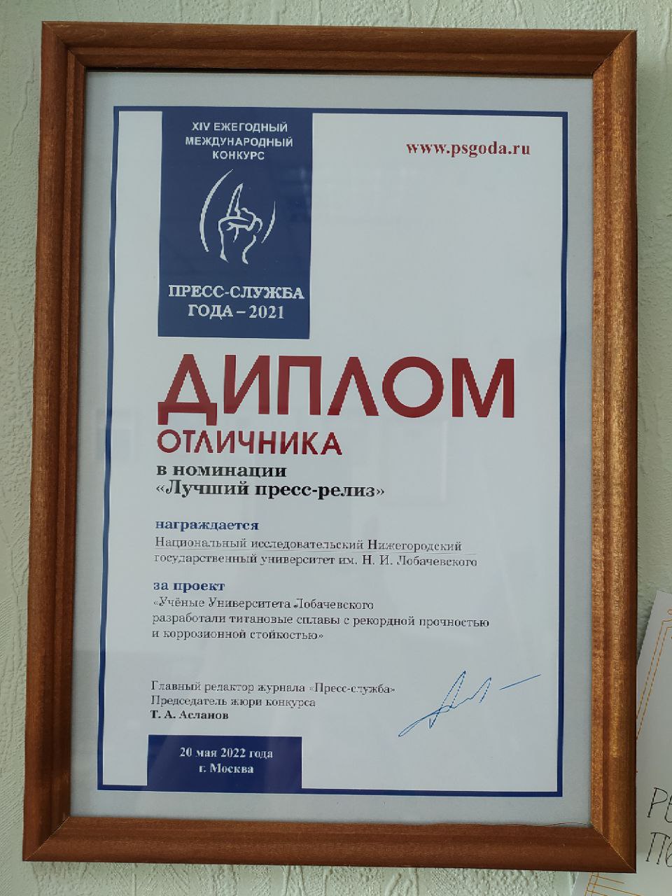 В 2022 году отдел пресс-службы ННГУ стал обладателем диплома отличника в номинации «Лучший пресс-релиз» конкурса «Пресс-служба года».