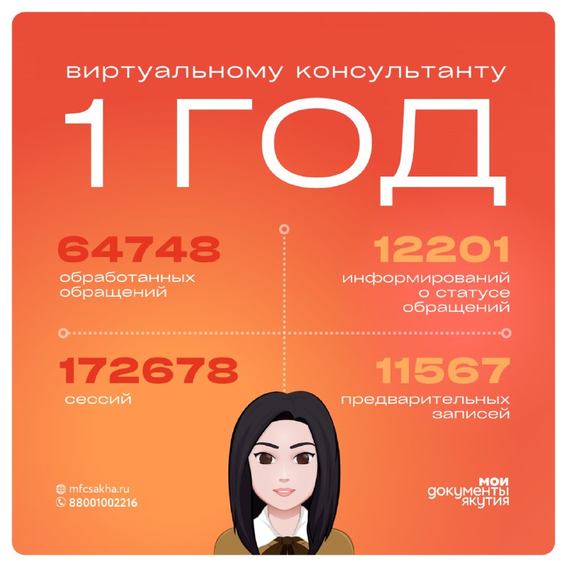 Стоит отметить, что сегодня у «Татьяны» день рождения - ровно год, как искусственный интеллект центра «Мои Документы» делает госуслуги доступнее для якутян. За год она обработала свыше 172 тысяч запросов граждан, научилась распознавать 137 национальных имён. С ее помощью за один год на прием записались уже более 11 тысяч граждан по всей республике. А уже совсем скоро умный помощник якутского МФЦ сможет консультировать граждан по телефону уже в режиме 24 на 7. Напомним, что связаться с «Татьяной» можно через портал центра «Мои Документы» bot.mfcsakha.ru, мессенджер Telegram @md_sakha_bot или через call-центр по номеру 8 800 100 22 16.