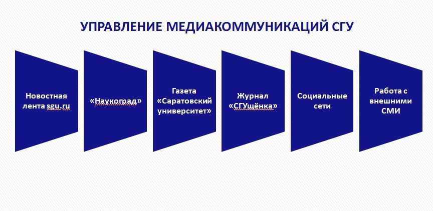 Реализацией информационной политики университета и выпуском корпоративных медиа (а это, прежде всего, главная новостная лента сайта sgu.ru, электронный научно-популярный журнал «Наукоград», газета «Саратовский университет», студенческий журнал «СГУщёнка», официальные аккаунты СГУ в социальных сетях) занимается Управление медиакоммуникаций Саратовского университета.
