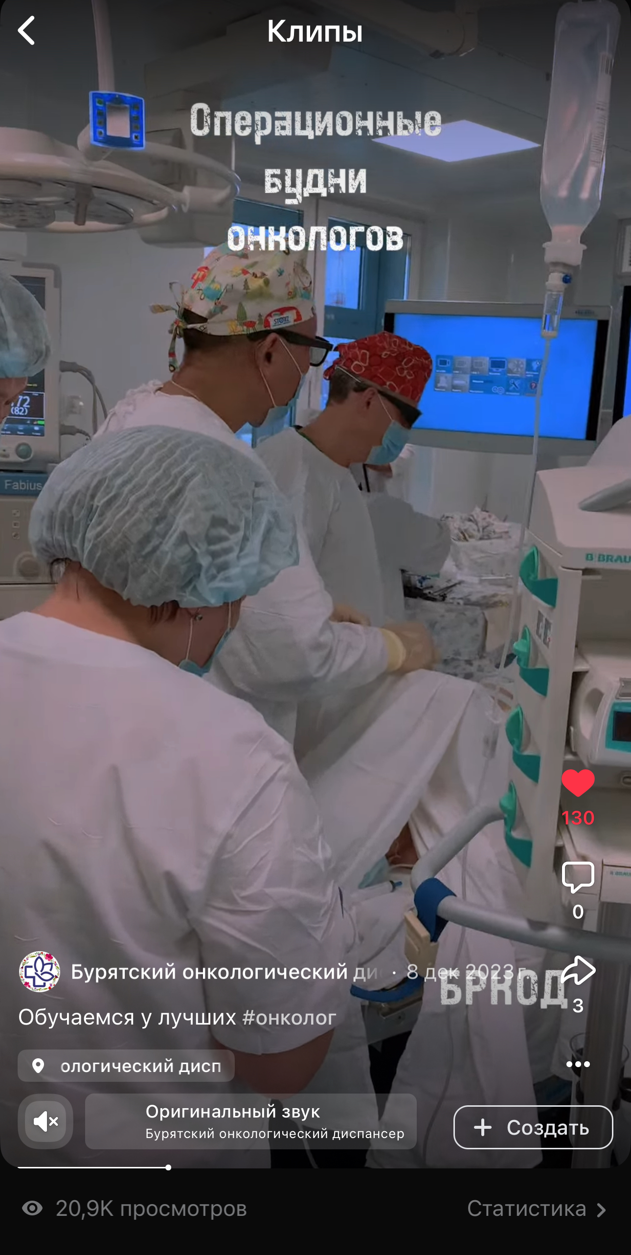 Одной из задач онкослужбы это формирование положительного имиджа врача. Силами одного специалиста в социальных сетях БРКОД появился проект "Операционные будни онкологов". Который за 4 месяца привлек внимание подписчиков и набрал более 250 000 просмотров.