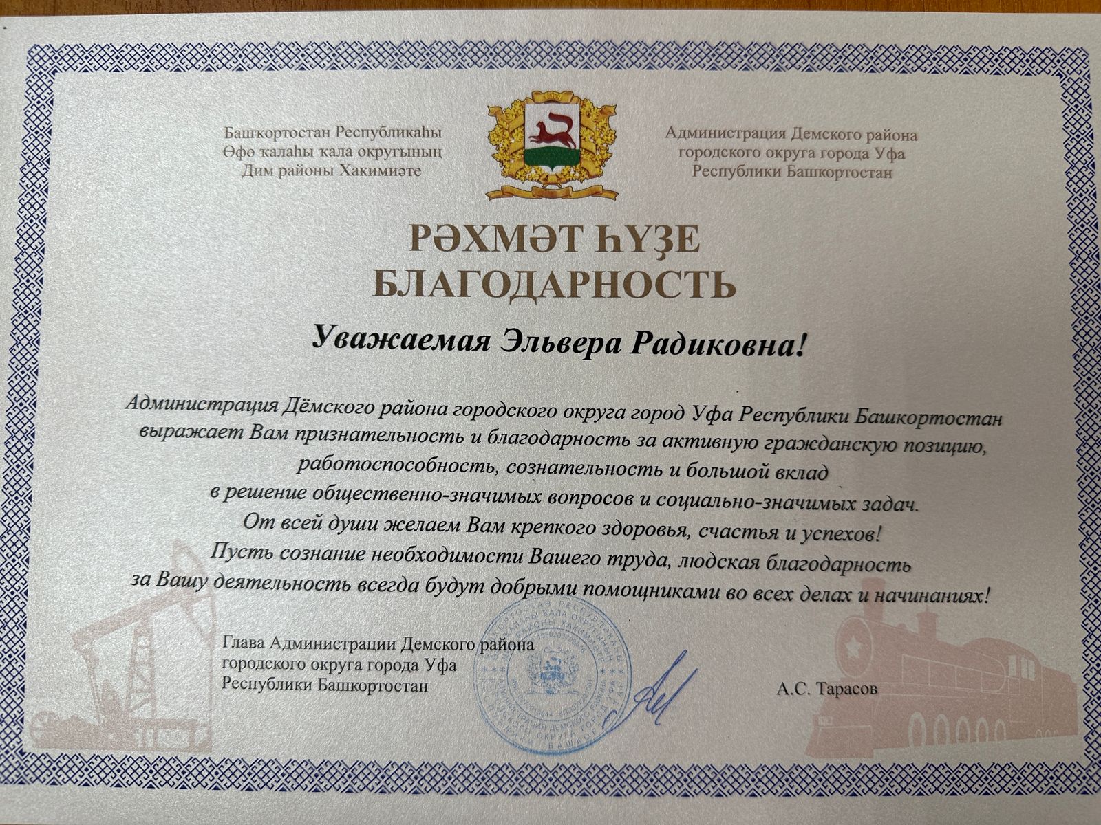 2. Работа пресс-секретаря Администрации в контексте поддержи "народного проекта" стал ярким кейсом поддержки гражданских инициатив, который был отмечен на уровне руководства Администрации Дёмского района и Администрации города Уфа.