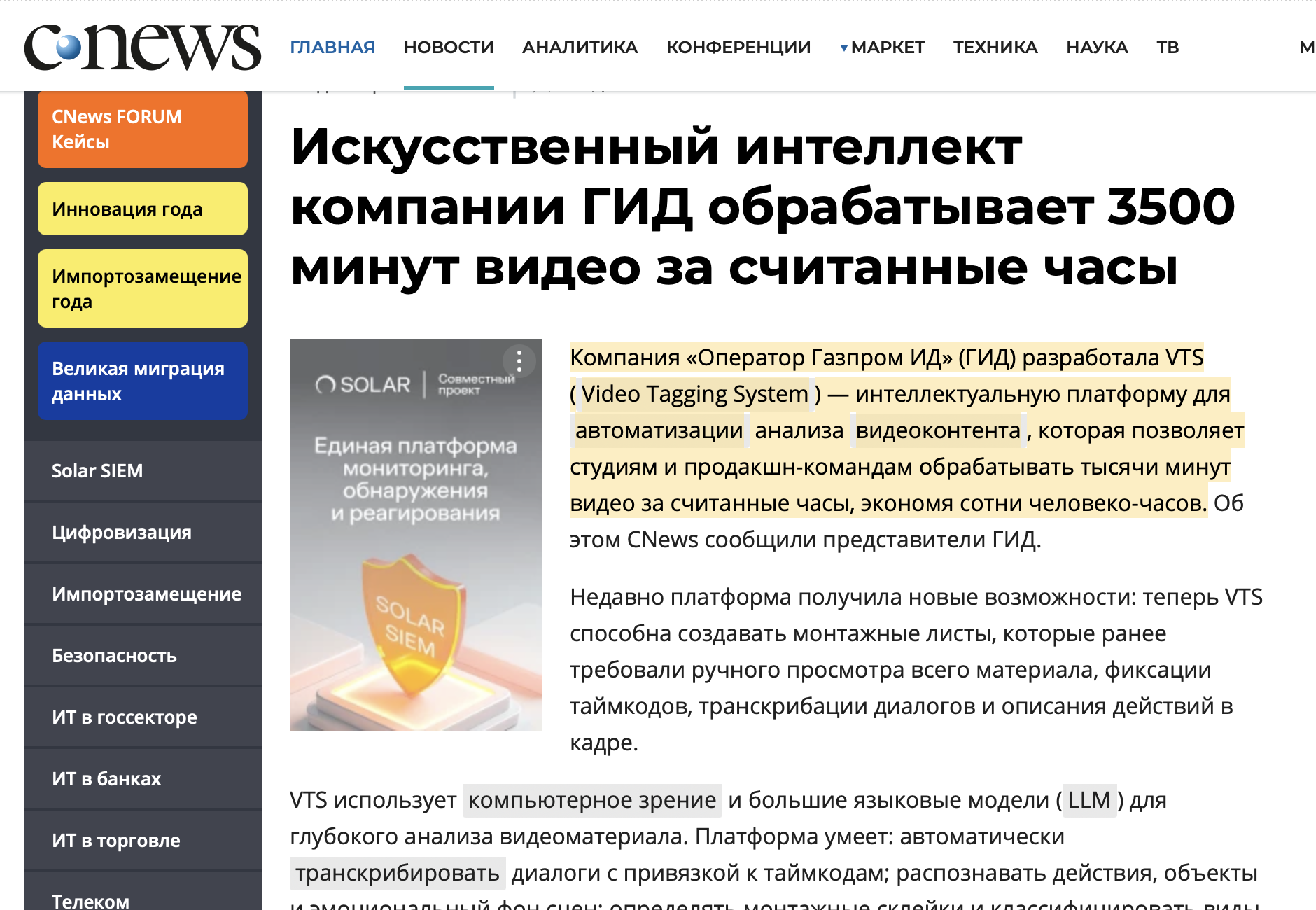 VTS (Video Tagging System) — ИИ-платформа компании «Оператор Газпром ИД» для глубокого семантического анализа видеоконтента и подбора контекстно-релевантных фрагментов под нативную рекламу