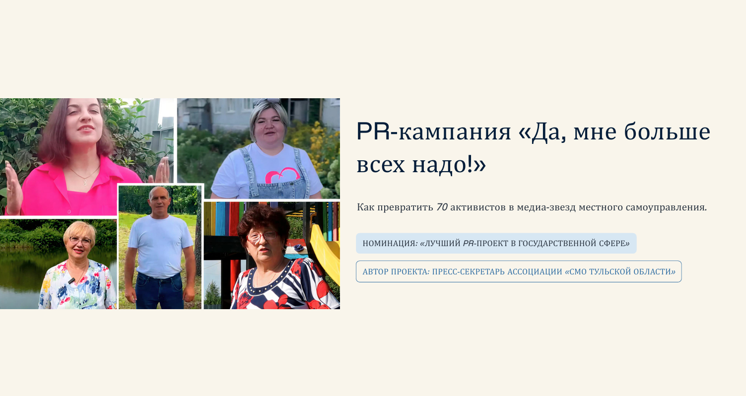 Задача: Сломать этот стереотип. Показать «человеческое лицо» местного самоуправления. Сделать так, чтобы фраза «мне больше всех надо» звучала не как упрек, а как жизненное кредо лидера.