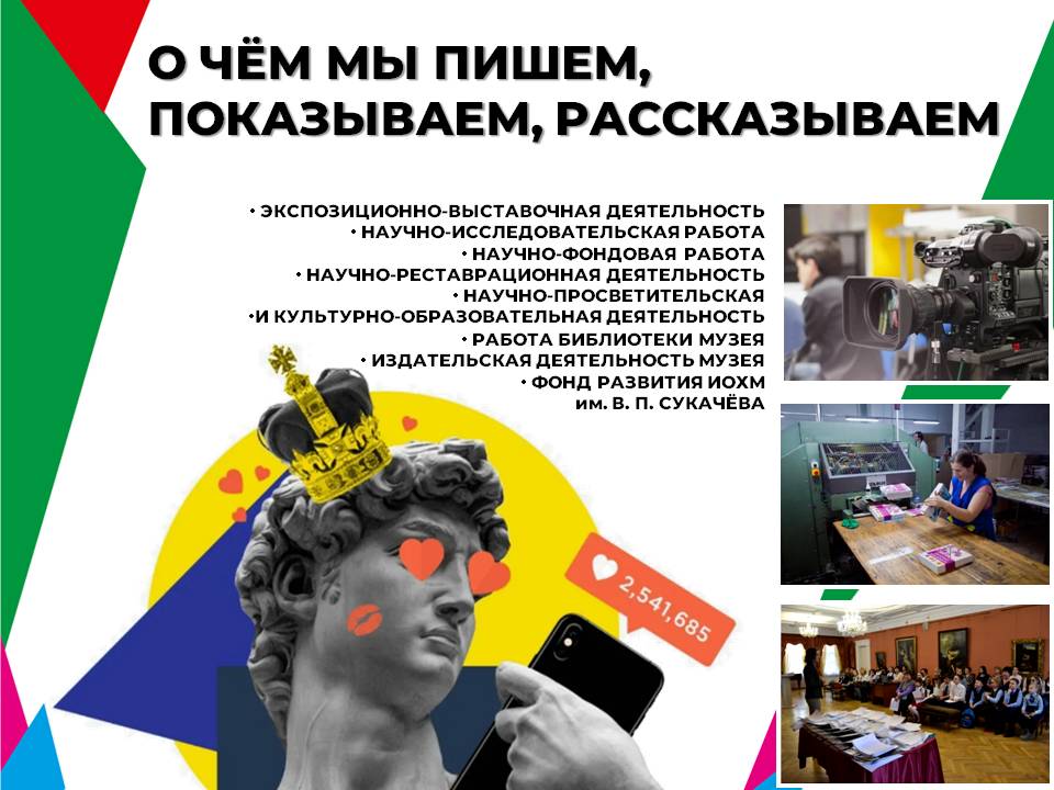 Наш музей – это музейщики, искусствоведы, научные сотрудники, художники-реставраторы, хранительницы залов, пиарщики, библиотекари, видеооператоры, фотографы и волонтёры DOBRO.RU. Мы не играем в «корпоративный футбол», потому что мы – одна команда, и мы играем за культуру.
