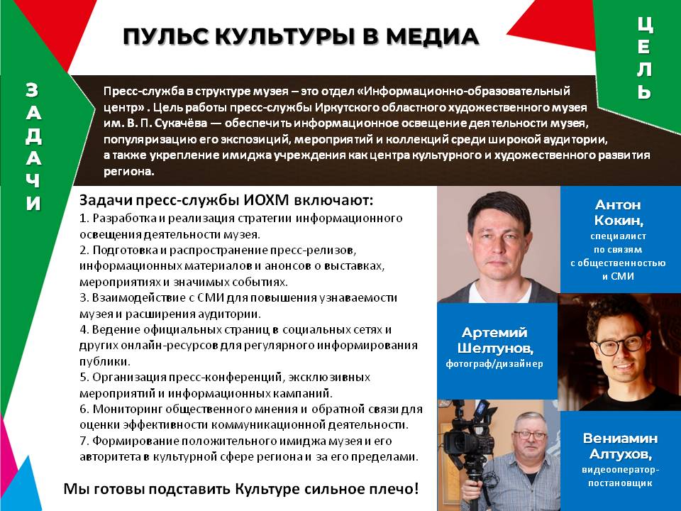 Пресс-служба в структуре музея – это отдел «Информационно-образовательный центр». Цель работы пресс-службы Иркутского областного художественного музея им. В. П. Сукачёва — обеспечить информационное освещение деятельности музея, популяризацию его экспозиций, мероприятий и коллекций среди широкой аудитории, а также укрепление имиджа учреждения как центра культурного и художественного развития региона.Результат проекта