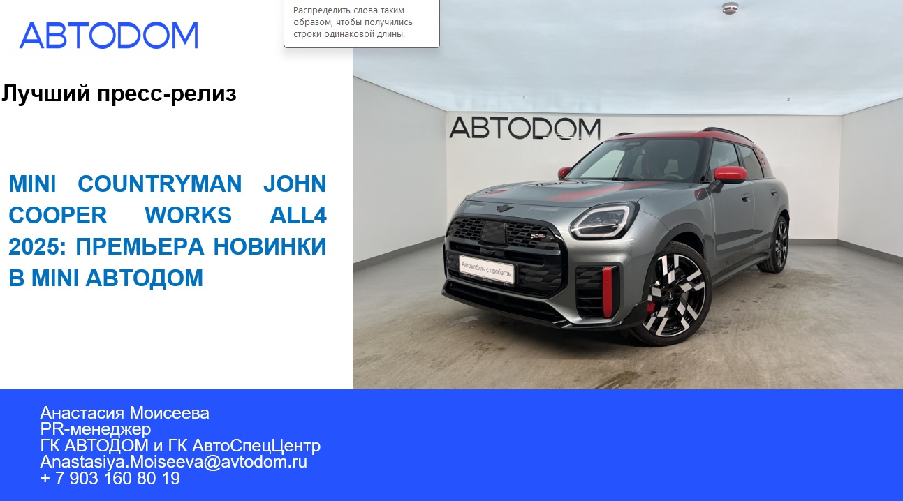 Информирование потенциальных клиентов и поклонников бренда MINI о старте продаж спортивного флагмана MINI Countryman John Cooper Works ALL4 2025 года в дилерском центре MINI АВТОДОМ. Наличие данной модели в дилерском центре ГК АВТОДОМ подчеркивает возможность автодилера предлагать своим клиентам уникальные автомобили и топовые новинки, которых нет на рынке у конкурентов. MINI Countryman John Cooper Works ALL4 – это уникальный автомобиль, выпущенный ограниченной серией, концепция которого связана с автоспортом. Модель сочетает в себе гоночное наследие и современные технологии, что позволяет привлечь клиентов, которые хотят приобрести не просто автомобиль, а ценят эксклюзивность.Результат проекта
