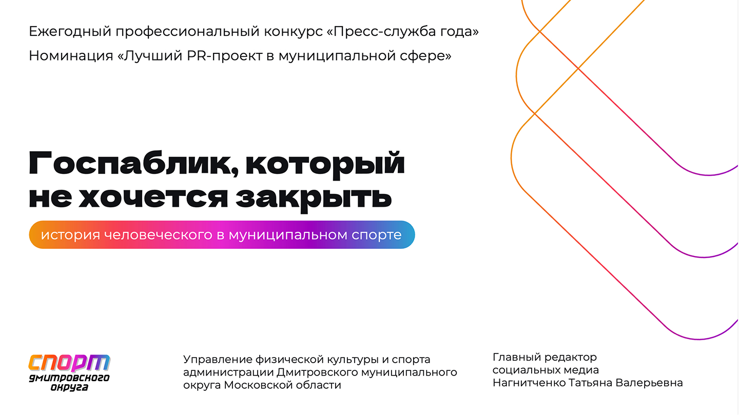 Проект «Госпаблик, который не хочется закрыть: история человеческого в муниципальном спорте» — это история о том, как за пять месяцев превратить отсутствие госпабликов в работающую систему коммуникаций, которая реально нужна людям. Мы не просто завели каналы в ВК и Telegram, а создали живую среду, где спорт в Дмитрове перестал быть «зоной официальных отчётов». Главная идея: новости делают те, кто внутри спорта — тренеры, методисты, администраторы из 20+ спортшкол, а главный редактор перерабатывает это в понятный, тёплый и полезный контент. Никакой воды, только то, что помогает родителям выбрать секцию, болельщикам — быть в курсе, а спортсменам — чувствовать себя звёздами. И всё это без рекламного бюджета, только на энтузиазме, партнёрствах и уважении к аудитории.Цель проекта