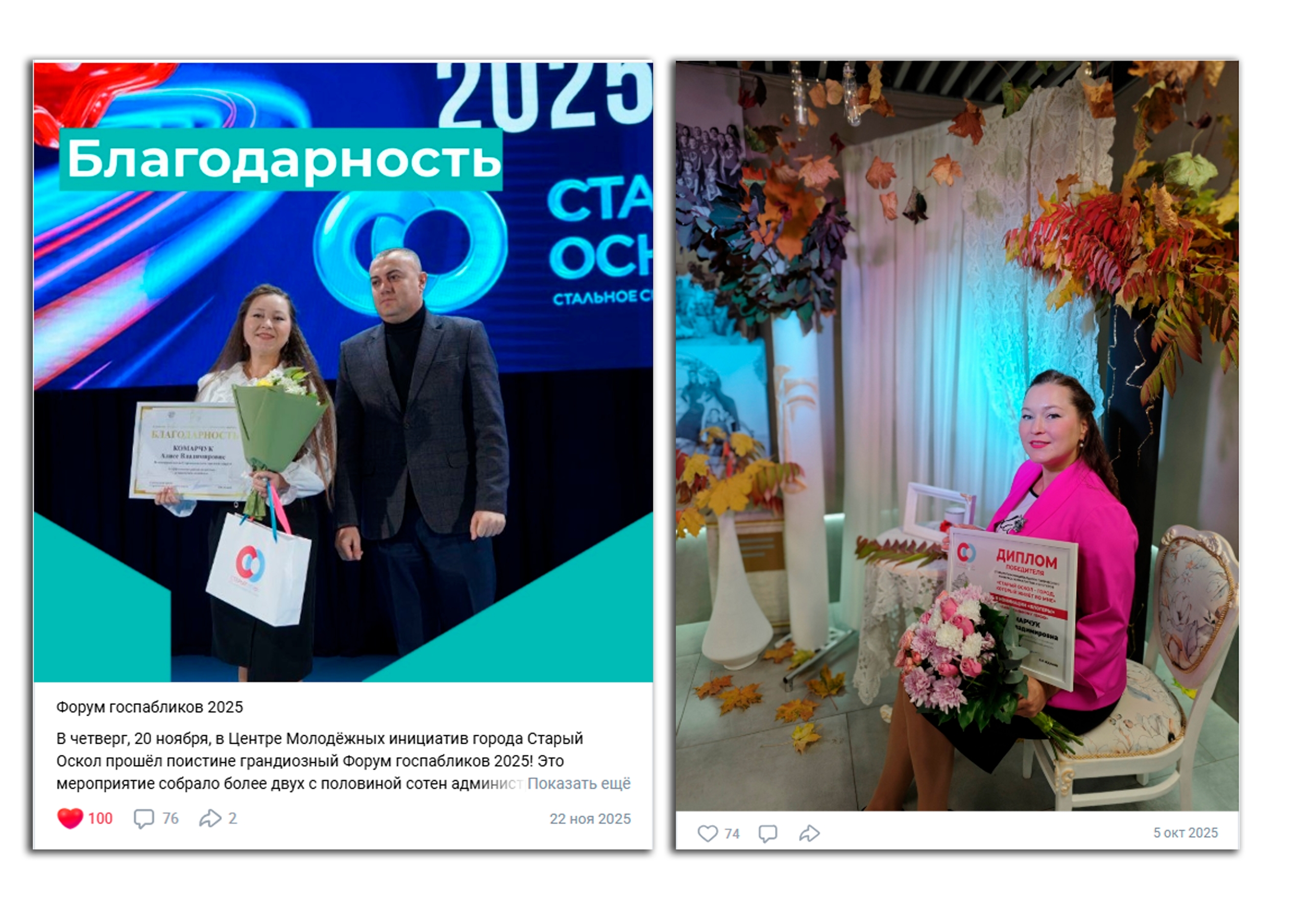 Администратор госпаблика награждена благодарностью администрации Старооскольского городского за эффективную работу по ведению и наполнению госпаблика и одно из интервью победило на муниципальном конкурсе «Старый Оскол — город, который живёт во мне».