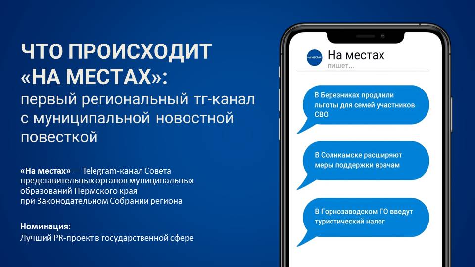 Будучи официальным каналом Совета представительных органов муниципальных образований Пермского края при Законодательном Собрании Пермского края, «На местах» обладает статусом официального источника. Это позволило ему не только стать популярным ресурсом для региональных СМИ, но и превратиться в эффективный инструмент продвижения информационных поводов для самих муниципалитетов.
