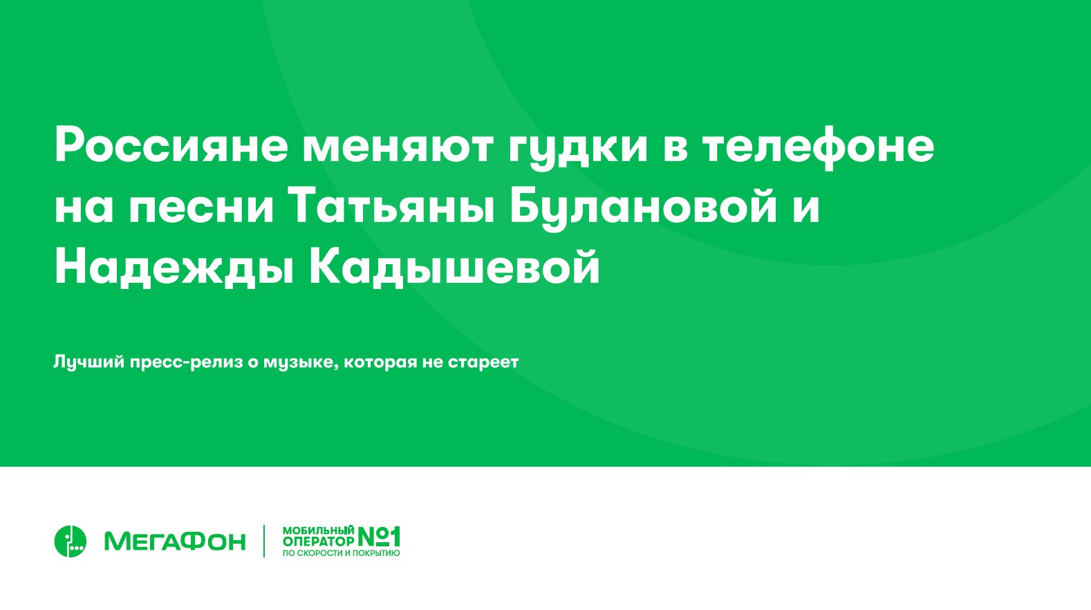 Как можно объединить популярные песни и МегаФон в одном пресс-релизе? Например, посмотреть статистику установки мелодий на гудок! В каталоге МегаФона оказались доступны песни и Надежды Кадышевой, и Татьяны Булановой – оставалось выяснить, вырос ли интерес к ним в разрезе замены гудков. Статистика МегаФона показала, что песни обеих исполнительниц попали в топ-10 по количеству установки их песен вместо гудков.