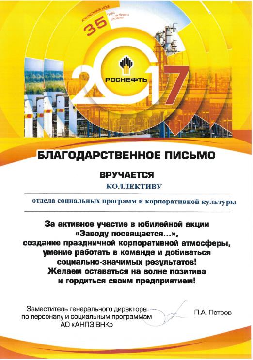 Автор(ы): Светличная Светлана Викторовна, начальник отдела социальных программ и корпоративной культуры АО "АНПЗ ВНК" , Михайлова Елена Алексеевна, специалист отдела социальных программ и корпоративной культуры АО "АНПЗ ВНК"