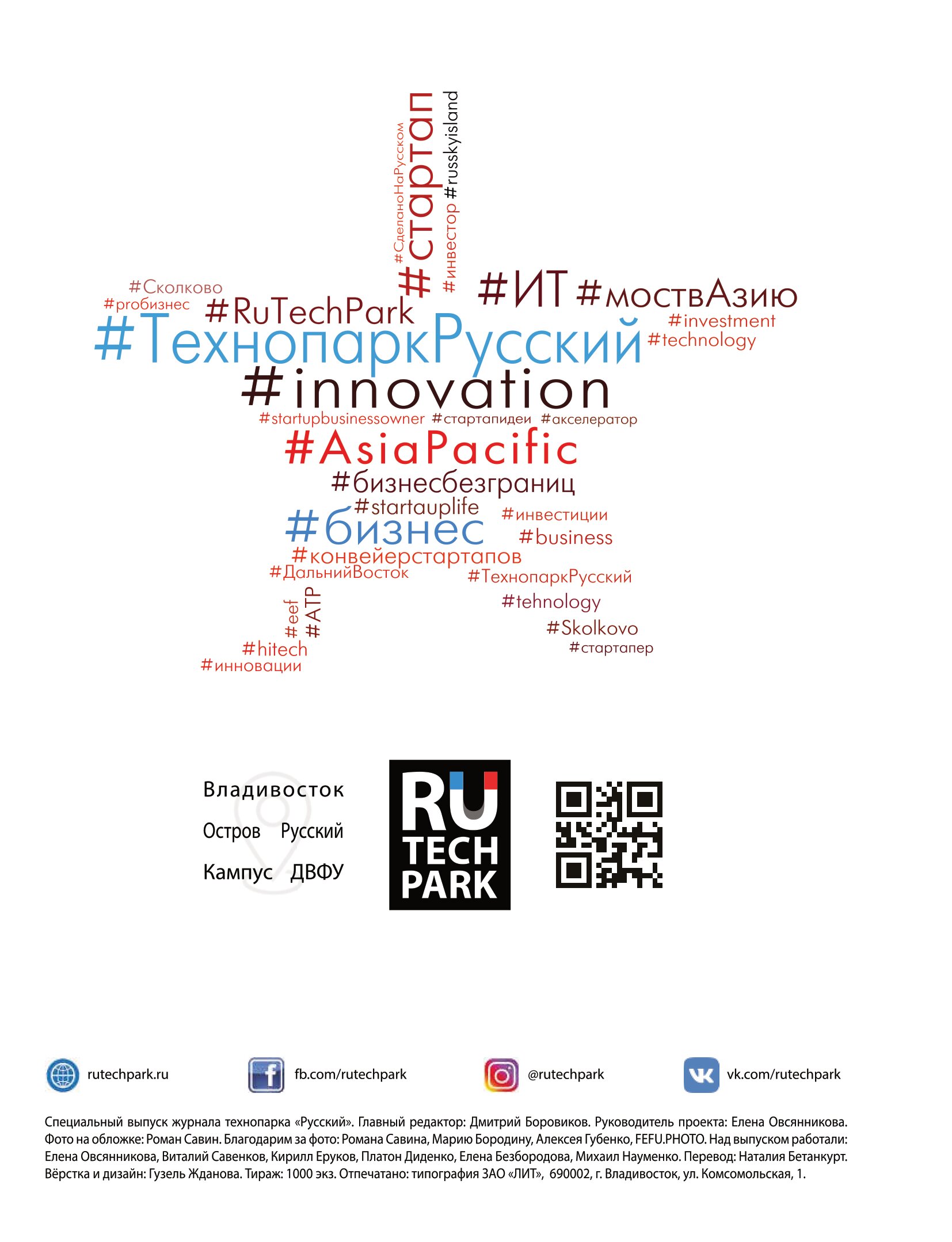 Первый журнал технопарка «Русский» вышел к ВЭФ в 2018 году. На обложке – главный корпус Дальневосточного федерального университета с использованием фирменных цветов ДВФУ.Формат журнала старой версии 170х235 мм, 300 г/м, 60 полос. Формат журнала 2019 года изменился: появилась «обложка-перевёртыш» (на русском и английском языках).