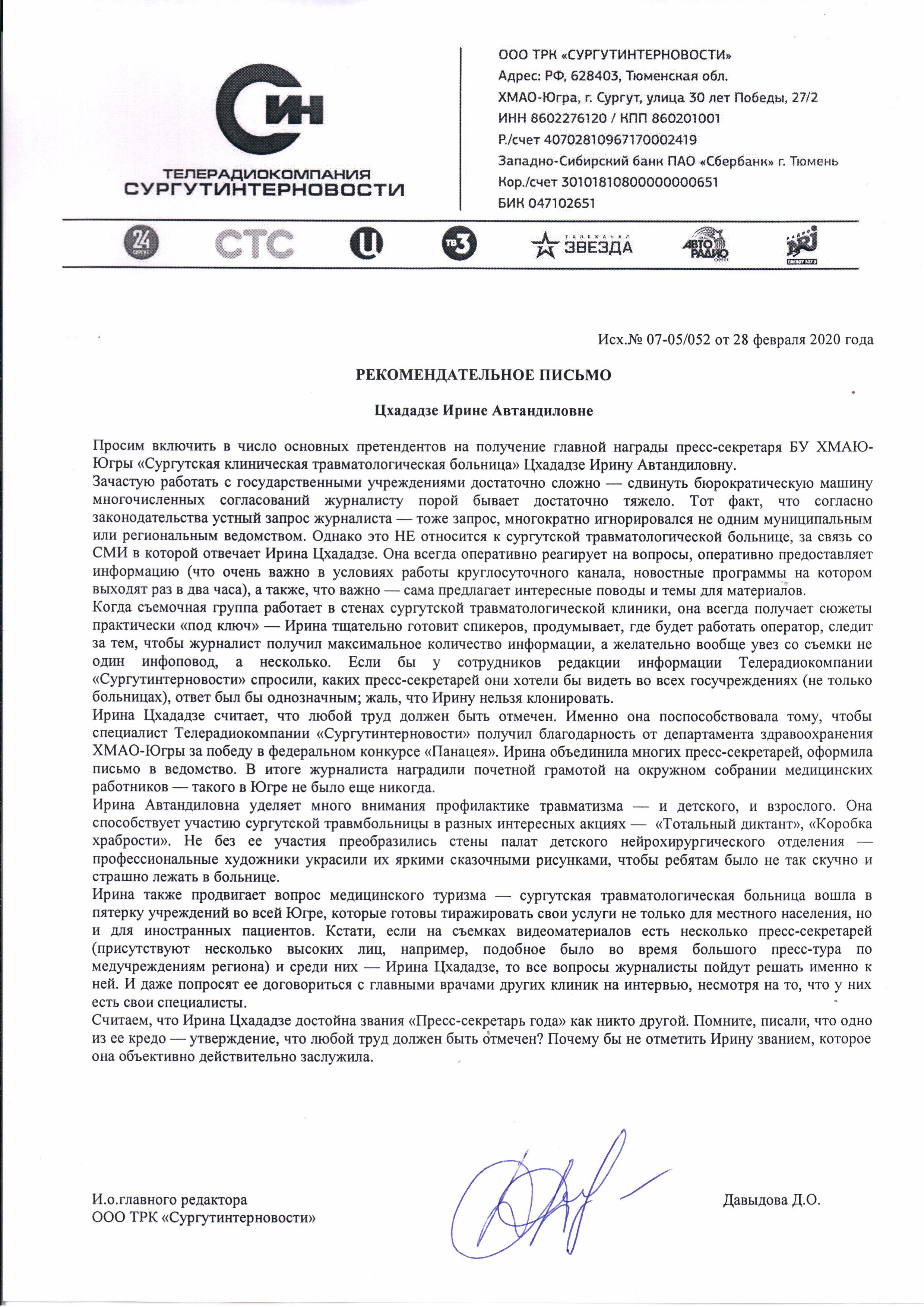 Ирина Цхададзе работает пресс-секретарем с 2009 года в БУ «Сургутская клиническая травматологическая больница». Самостоятельно организовала работу пресс-службы в лечебном учреждении, наладила контакты со СМИ различных уровней и т.д. Материалы о клинике издаются в федеральных, областных, окружных и муниципальных изданиях. Ведется сайт клиники, а также социальные сети.Цхададзе И.А. также готовила авторские блоги в городских СМИ, посвященные деятельности больницы, работе врачей, профилактике травматизма и т.д.