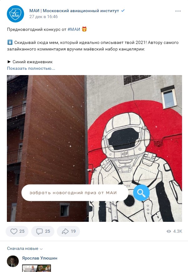 Основная группа МАИ ВКонтакте состоит из 27 993 участников из числа студентов, сотрудников и преподавателей, а также недавних выпускников, и продолжает активно расти. С приходом в МАИ в 2021 году СММ-специалиста Дарьи Васениной поменялась контентная политика основной группы. Преподнесение информации обрело более молодёжный стиль, появились интерактивы и мемы. В свою очередь это дало активный отклик со стороны аудитории - участники группы стали чаще проявлять активности под постами, давать обратную связь. Дарья - достаточно новый человек в коллективе пресс-службы МАИ, но уже успела показать хорошие результаты работы и ставит амбициозные цели по развитию маёвских соцсетей.