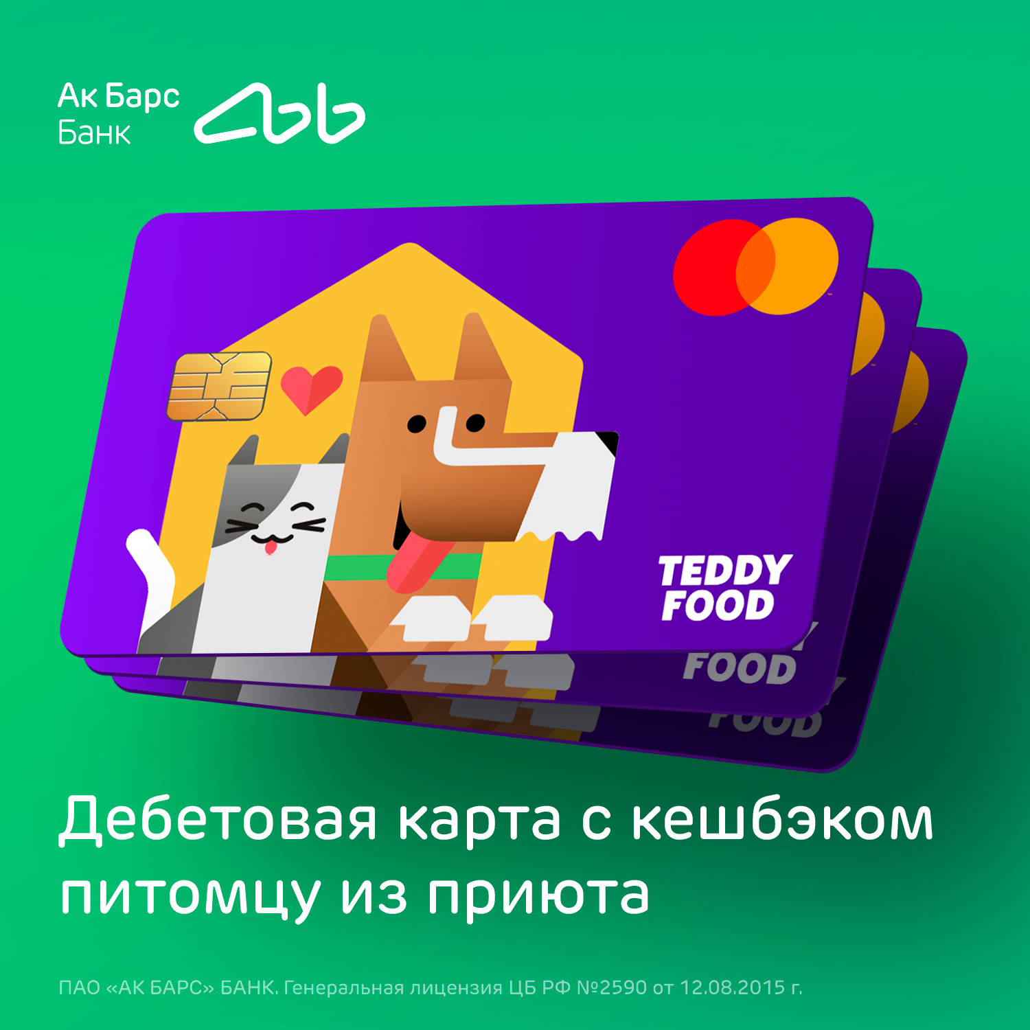 Бесплатная дебетовая карта Teddy Food — это первый подобный финансовый продукт в стране. В основе карты лежит идея, что многие из нас хотели бы помогать бездомным животным, но либо не знают, как это сделать, либо им не хватает времени. Возможности карты позволяют помогать животным из приютов, не прилагая усилий, просто совершая повседневные покупки. Все больше людей задумываются о разумном и ответственном потреблении, о вопросах социальной ответственности. Ак Барс Банк разделяет эти ценности и готов помочь в доброй волонтерской миссии.