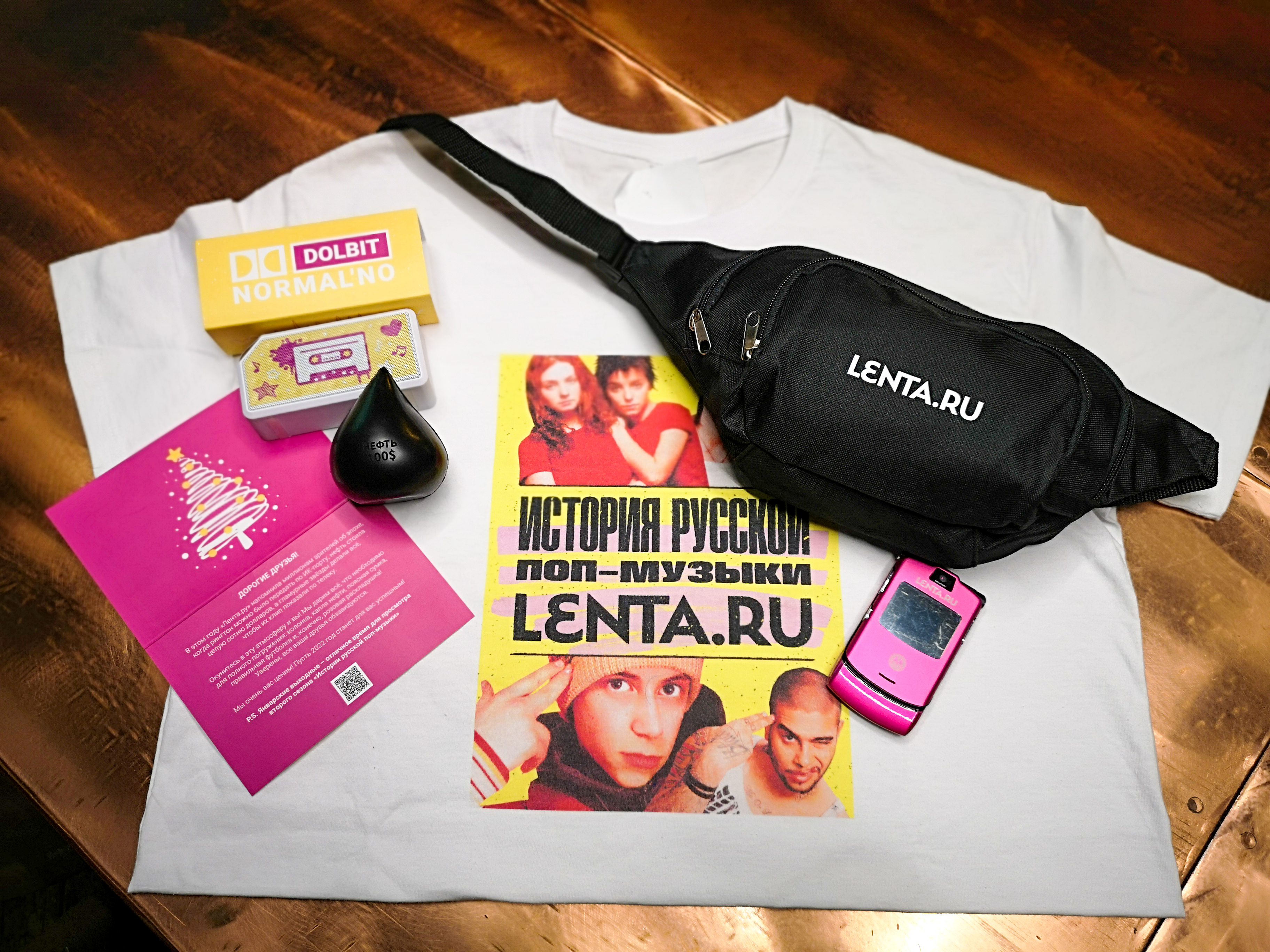 Одной из задач также было объединение этих двух разных аудиторий. Во-первых, их вели на один специальный лэндинг, который передавал сильные эмоции музыкальной культуры нулевых и в то же время был интересен молодёжи за счет анимации, коротких клиповых фраз, ярких образов. Во-вторых, был разработан тематический мерч, который рассылали в подарочных наборах. Состав «стартерпака нулевых»: поясная сумка как ключевая деталь модного образа тех годов, футболка с официальным постером проекта, стилизованная портативная колонка, антистресс-игрушка «капля нефти» с надписью «нефть 100$», открытка с QR-кодом и ярко-розовая Motorola RAZR – флагман 2004 года и утрированный символ той эпохи.
