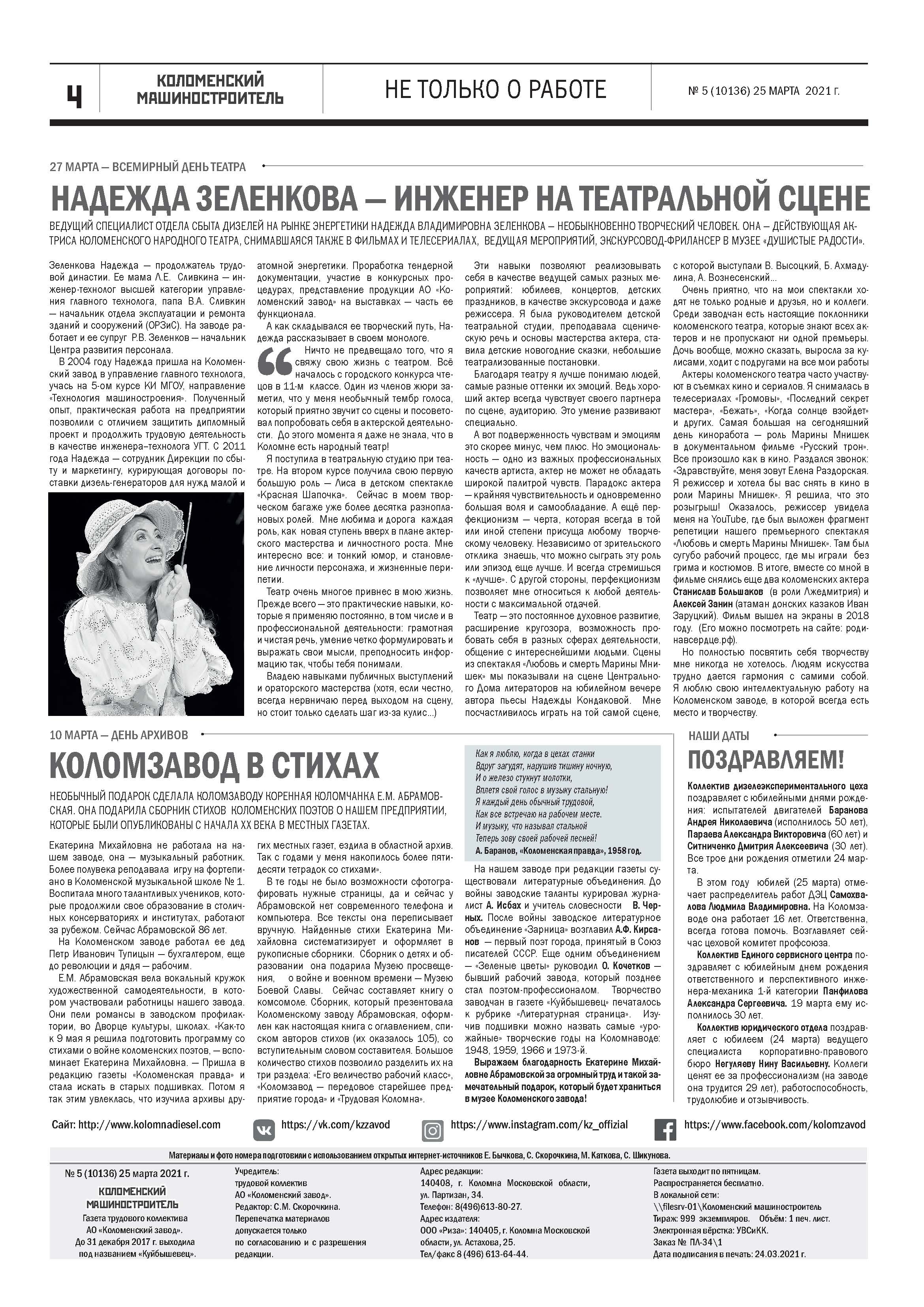 - - Обеспечение регулярного выпуска корпоративной газеты «Коломенский машиностроитель».