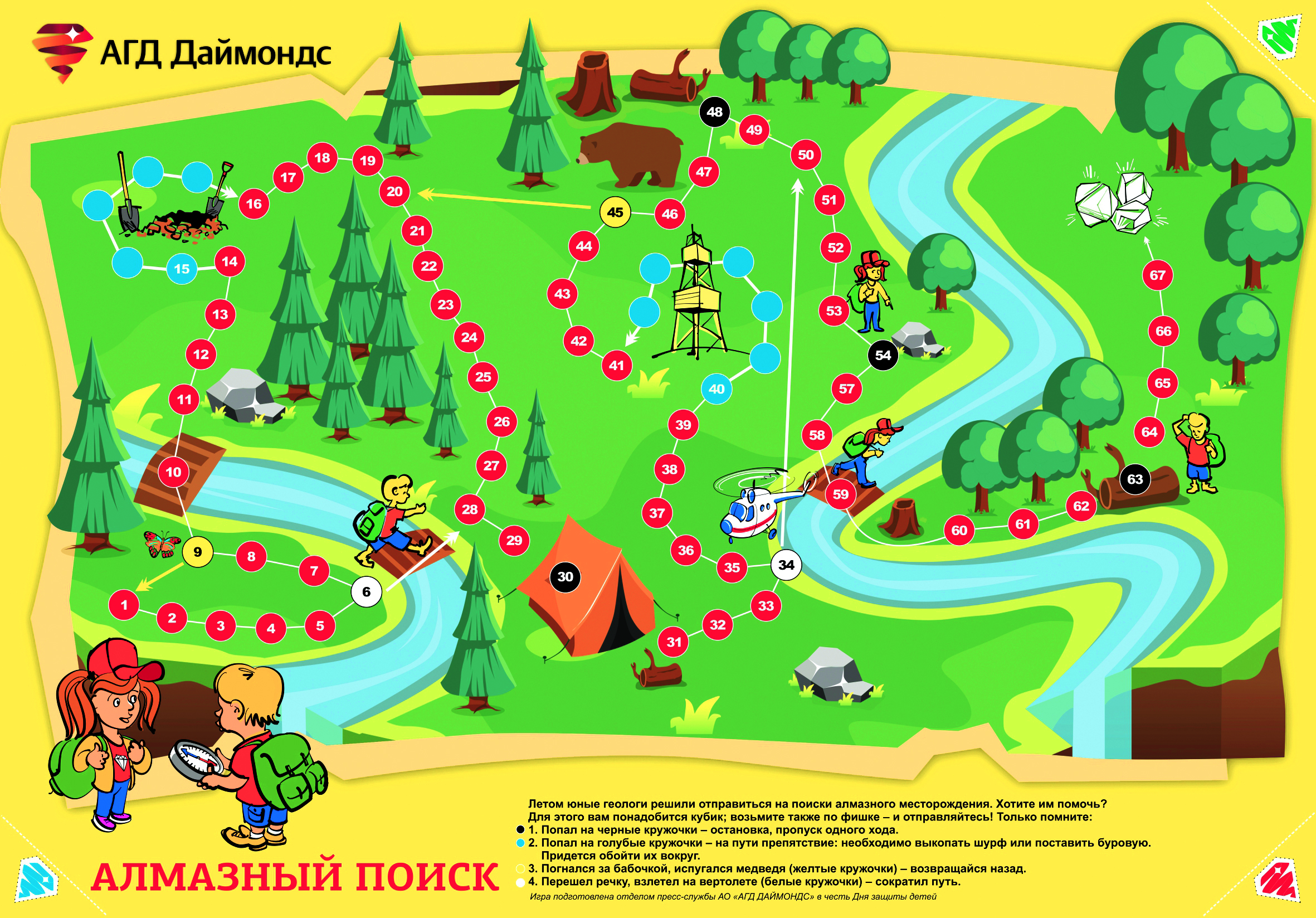 В центре сюжета – поиск юными геологами алмазного месторождения. Игрокам предстоит им помочь. Нужно бросать кубик и ходить по клеткам, цвет которых имеет значение и может как затормозить, так и ускорить продвижение по полю. Кто первым добрался до месторождения – тот и победил. На финише игроков ждет долгожданное открытие алмазной кладовой.