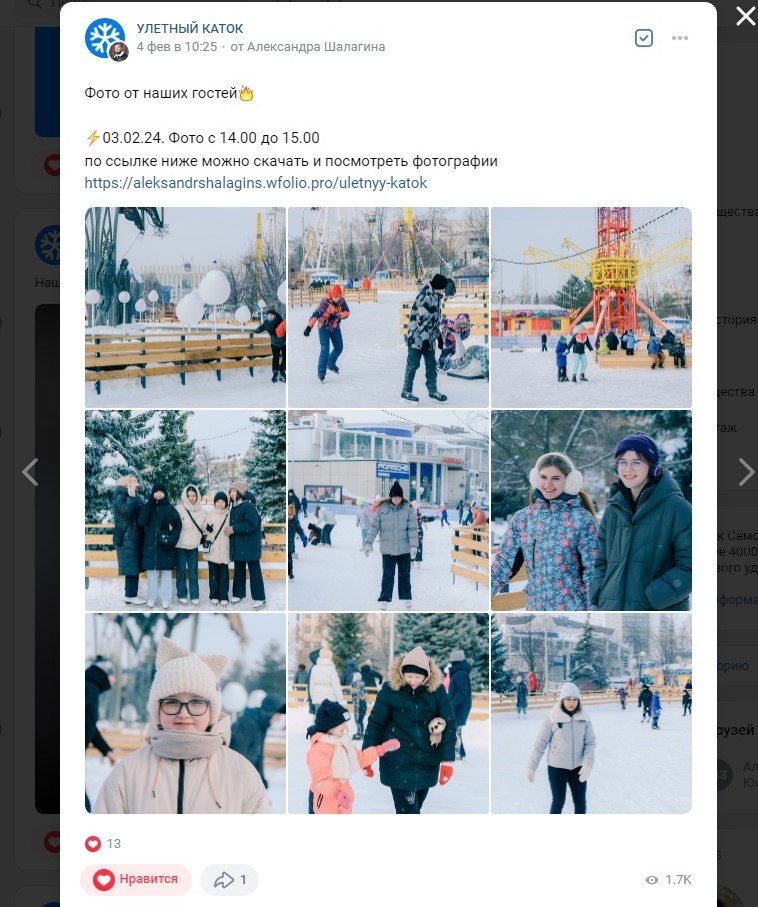 - Активно используется такой инструмент привлечения пользователей и обратной связи - как отклики и оценки гостей с их фотографиями с катка - это публикуется в официальной группе катка во "ВКонтакте". В том числе мы открыли возможность гостям самим публиковать свои фото в основном альбоме сообщества - делиться своими позитивными фото! И как результат - каток за весь сезон 2023 - 2024 посетили более 70 000 гостей. И более 60 % из них - бесплатно!