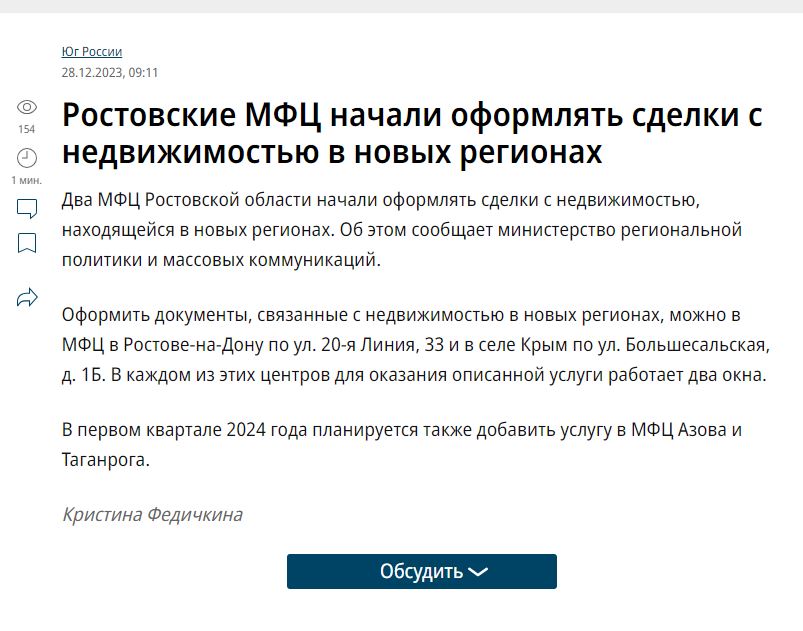 - Оперативная реакция при обращении жителей новых территорий РФ по услугам, предоставляемых МФЦ;- Информация из первоисточника в социальных сетях о порядке взаимодействия при обращении;