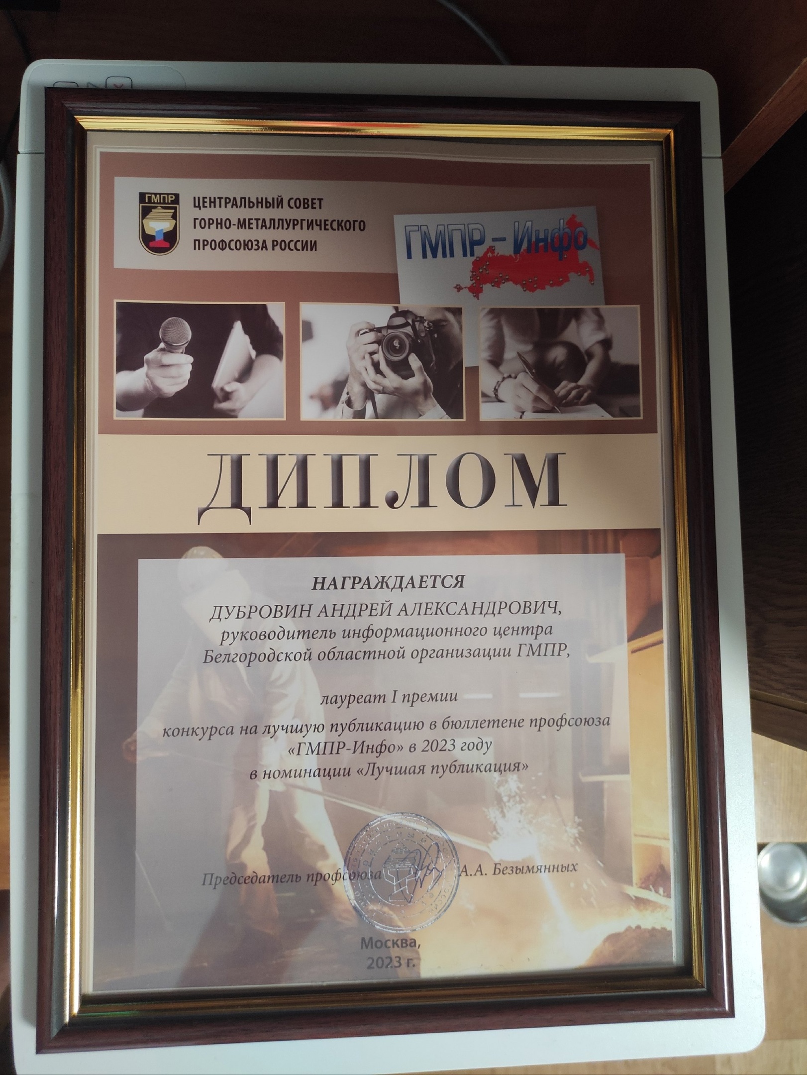 По решению Исполкома Центрального Совета ГМПР в конкурсе «На лучшую публикацию в бюллетене профсоюза «ГМПР-Инфо» в 2023 году Андрей Дубровин удостоен первой премии. https://www.gmpr.ru/news/novosti_profsoyuza/24410/