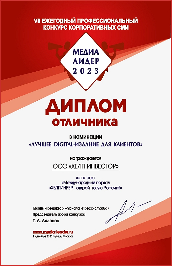 Отличником профессионального конкурса корпоративных СМИ «МЕДИАЛИДЕР - 2023» в номинации «Лучшее digital-издание для клиентов»: https://www.media-leader.ru/