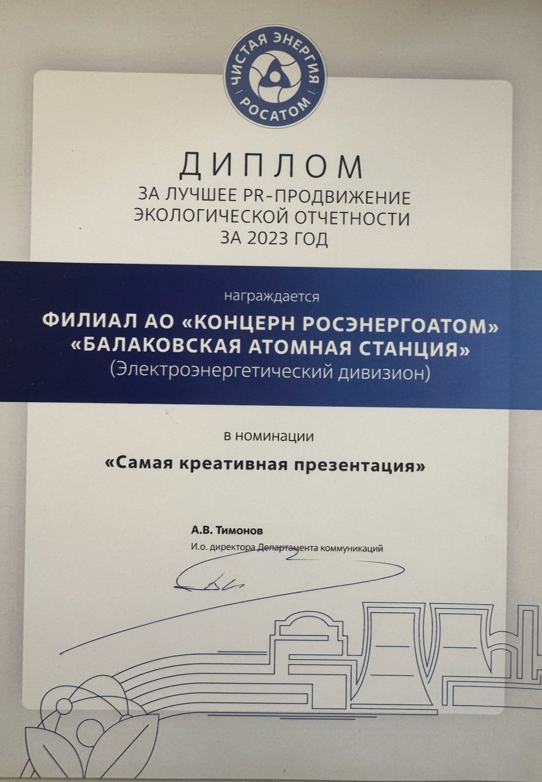 За высокий уровень проведения и достижения требуемых результатов в экологии Балаковская АЭС награждена дипломом Госкорпорации «Росатом» за лучшее PR-продвижение экологической отчетности в номинации «Самая креативная презентация».