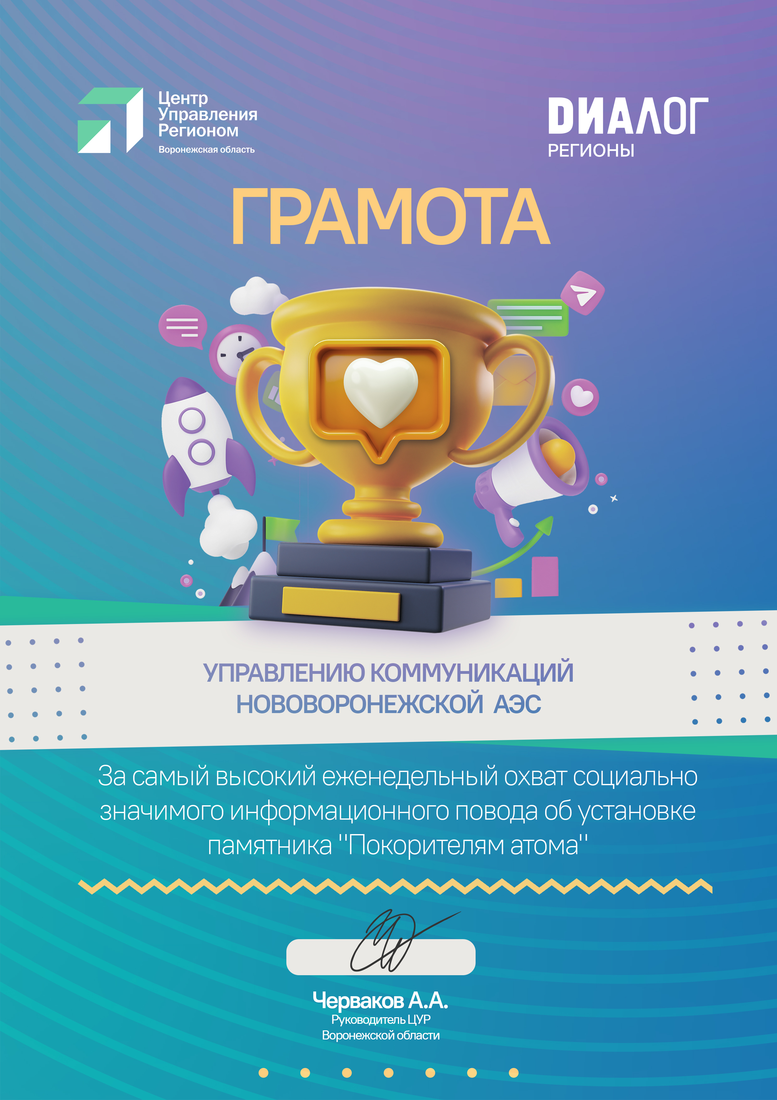 Создавая и масштабируя инфоповоды, за 2024 год получили 237 публикаций более чем в 50 региональных и федеральных СМИ (например, ТАСС, ГТРК Воронеж, РИА Воронеж, АиФ, Российская газета). Охват аудитории: в региональных СМИ — более 1 млн человек, в федеральных — более 22 млн человек. Новость об открытии в Нововоронеже нового памятника «Покорителям атома» вошла в ТОП поводов недели по данным ЦУР Воронежской области (2 место после новости об атаке БПЛА; 252 публикации в СМИ и соцсетях с охватом 11,7 млн).Статистика креативного ролика: 60 тыс просмотров, охват – 34 тыс, 26 тысяч переходов на лендинг и 232 заявки на очную экскурсию.