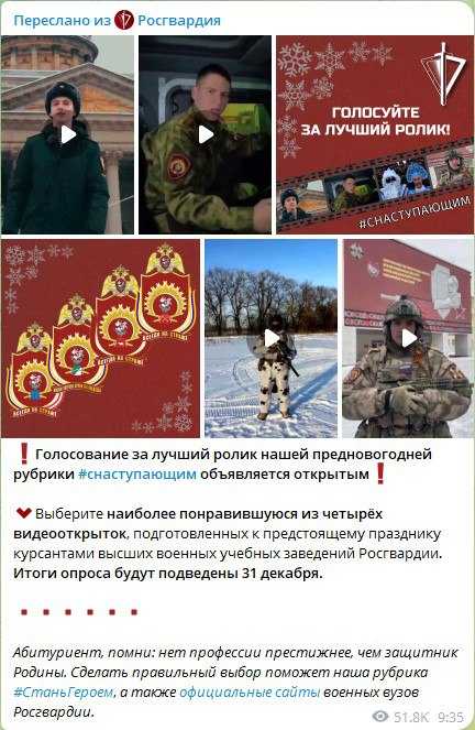 Также на официальной странице Росгвардии в Телеграм проведён конкурс новогодних поздравлений #Снаступающим среди курсантов военных образовательных организаций высшего образования войск национальной гвардии. Общее количество просмотров – более 150 тыс.