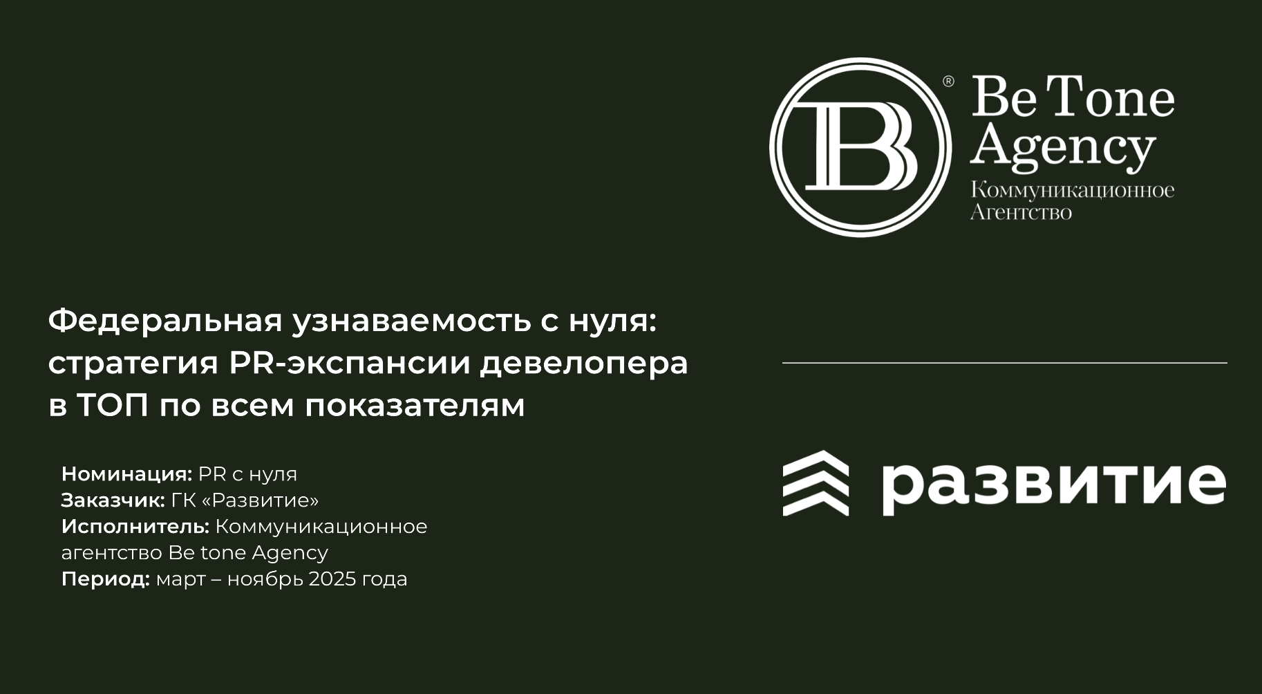 Несмотря на значительные масштабы бизнеса (7 регионов присутствия, свыше 2 млн кв. м жилья в портфеле), ГК "Развитие" практически отсутствовала в федеральных СМИ, не имела PR-службы и ассоциировалась преимущественно с Воронежем. Целью коммуникационного агентства Be Tone Agency стало создание с нуля устойчивой репутации надежного федерального девелопера и признанного эксперта отрасли для усиления позиций на новых рынках и в диалоге с партнерами.