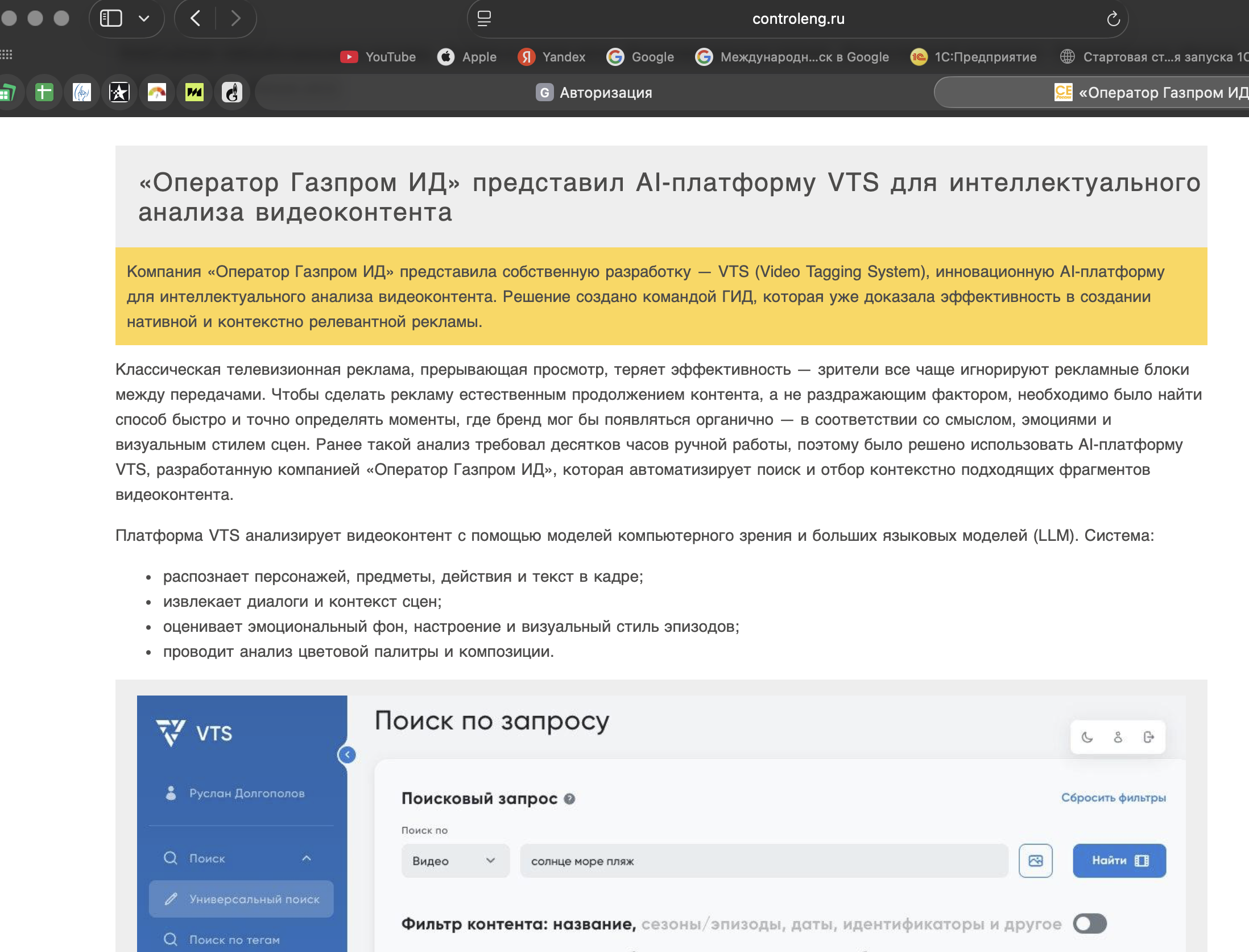 VTS (Video Tagging System) — ИИ-платформа компании «Оператор Газпром ИД» для глубокого семантического анализа видеоконтента и подбора контекстно-релевантных фрагментов под нативную рекламу