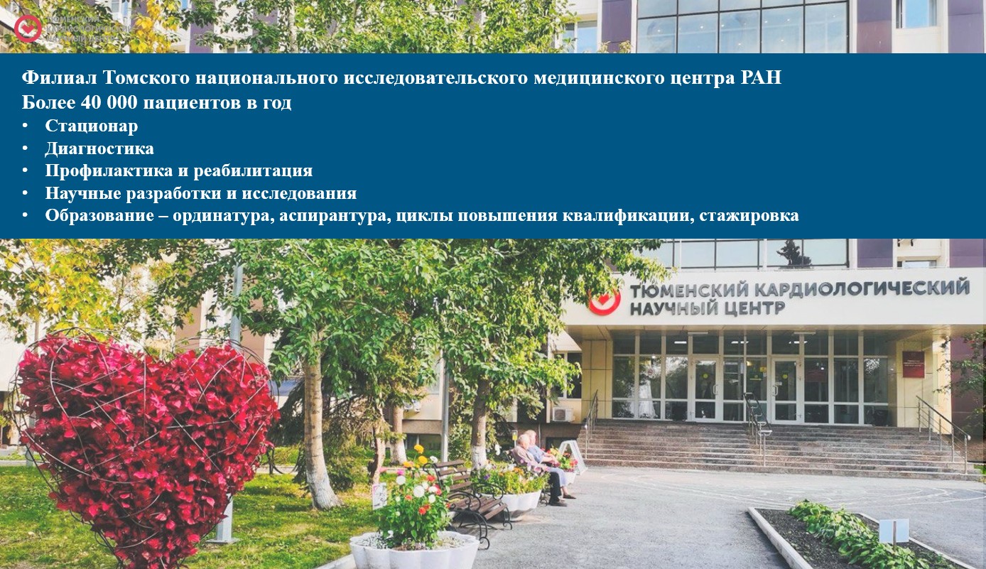 Тюменский кардиологический научный центр – филиал Федерального государственного бюджетного научного учреждения «Томский национальный исследовательский медицинский центр РАН» – уникальное научно‑медицинское учреждение, объединяющее клинико‑диагностическую практику и фундаментальные исследования сердечно‑сосудистых заболеваний. За 40 лет работы центр стал одним из крупнейших кардиоцентров России, единственным специализированным учреждением УрФо, внедряя высокотехнологичные методы диагностики и лечения, и ежегодно оказывая помощь более 40 000 пациентам.