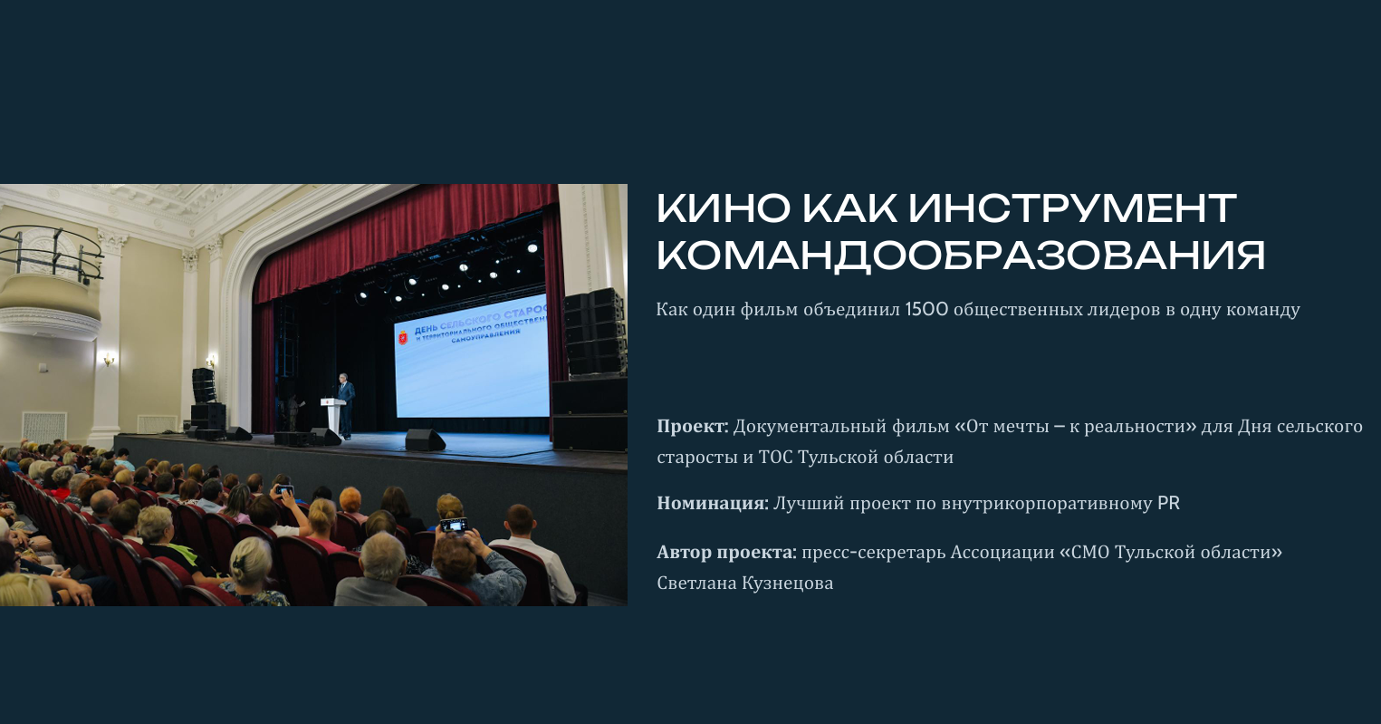 Мы применили инструмент внешнего PR (документальное кино) для решения задач внутренних коммуникаций, подняв статус события и героев. Задача стояла в том, чтобы превратить разовое мероприятие в повод для укрепления корпоративного духа, дать внутренней аудитории (сотрудникам администраций и общественным активистам) не просто поздравление, а зеркало, в котором они увидят себя, свою миссию и своих коллег, осознав силу сообщества.