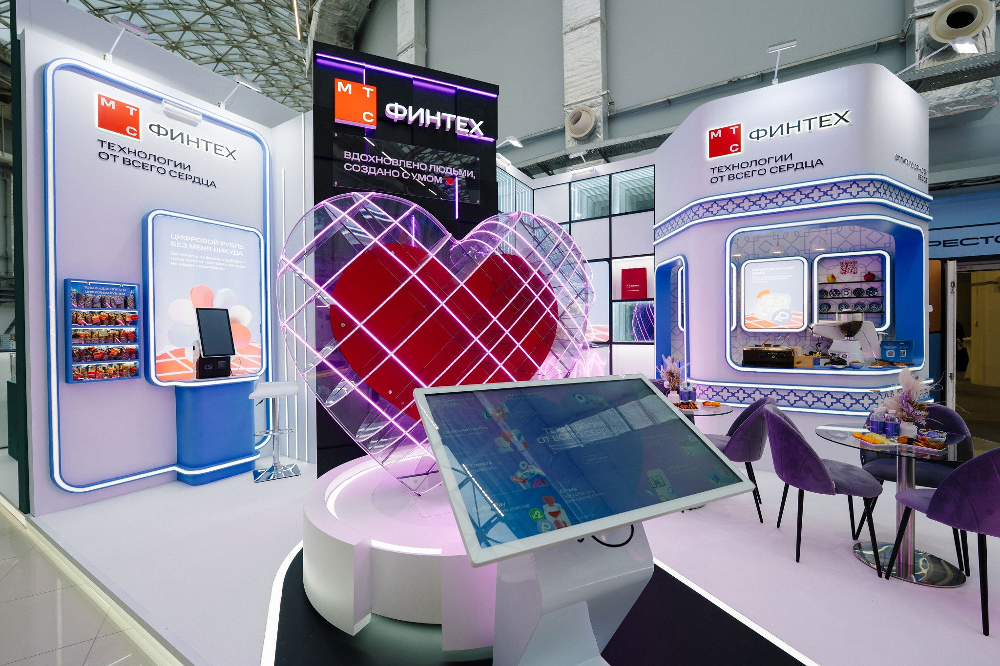 Финтех-решения, представленные на стенде: Добро Pay, сим-карта с функцией банковской карты, оплата связи умной колонкой, оплата по QR-коду, МТС Оплата, МТС Инвестиции, ЦФА в мессенджере, Цифровой рубль, МТС ID, МТС Флекс.