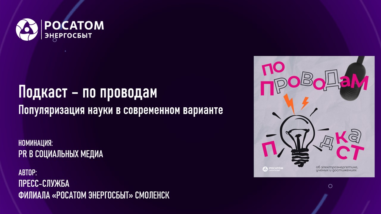 Аудиоподкасты – это новый инструмент для укрепления имиджа компании и нативной рекламы цифровых сервисов компании «Росатом Энергосбыт». Через истории великих ученых и факты об электроэнергетике мы не просто просвещаем аудиторию, но и показываем, как достигать поставленных целей. Важно отметить подход к производству: были оптимизированы ресурсы, применен искусственный интеллект. Это позволило получить качественный аудиопродукт без затрат на профессиональную студию.