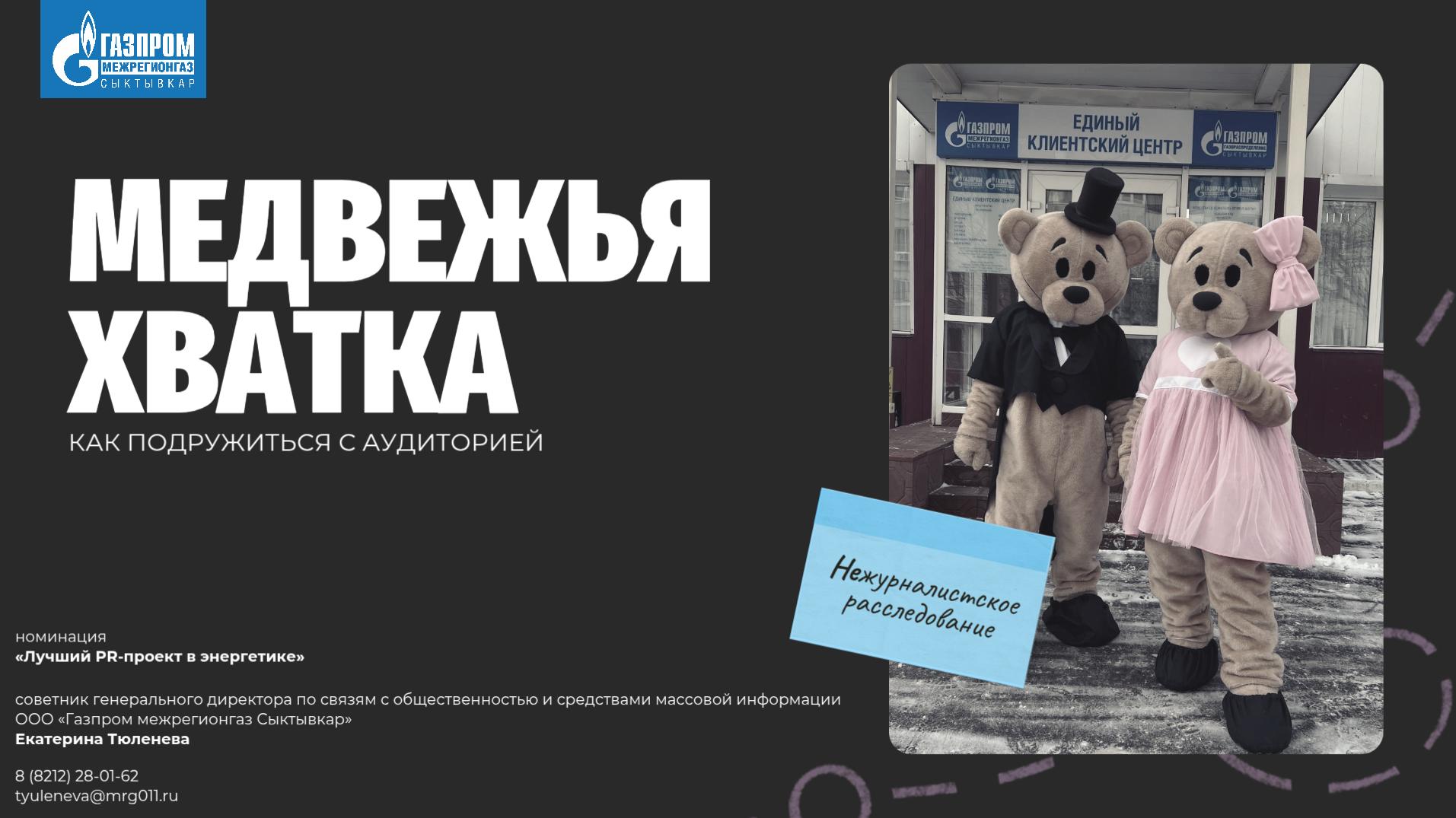 PR‑проект «Медвежья хватка. Как подружиться с аудиторией» был разработан с целью выстраивания эффективной коммуникации с потребителями по ключевым темам: газовая безопасность, платёжная дисциплина и газификация. Проект решил актуальную задачу взаимодействия с обширной целевой аудиторией в условиях «баннерной слепоты» и современных коммуникационных вызовов. Целевая аудитория проекта охватила все возрастные группы от 16 лет и до людей пожилого возраста с разными информационными потребностями и предпочтениями в способах получения сведений, что требовало комплексного и дифференцированного подхода.