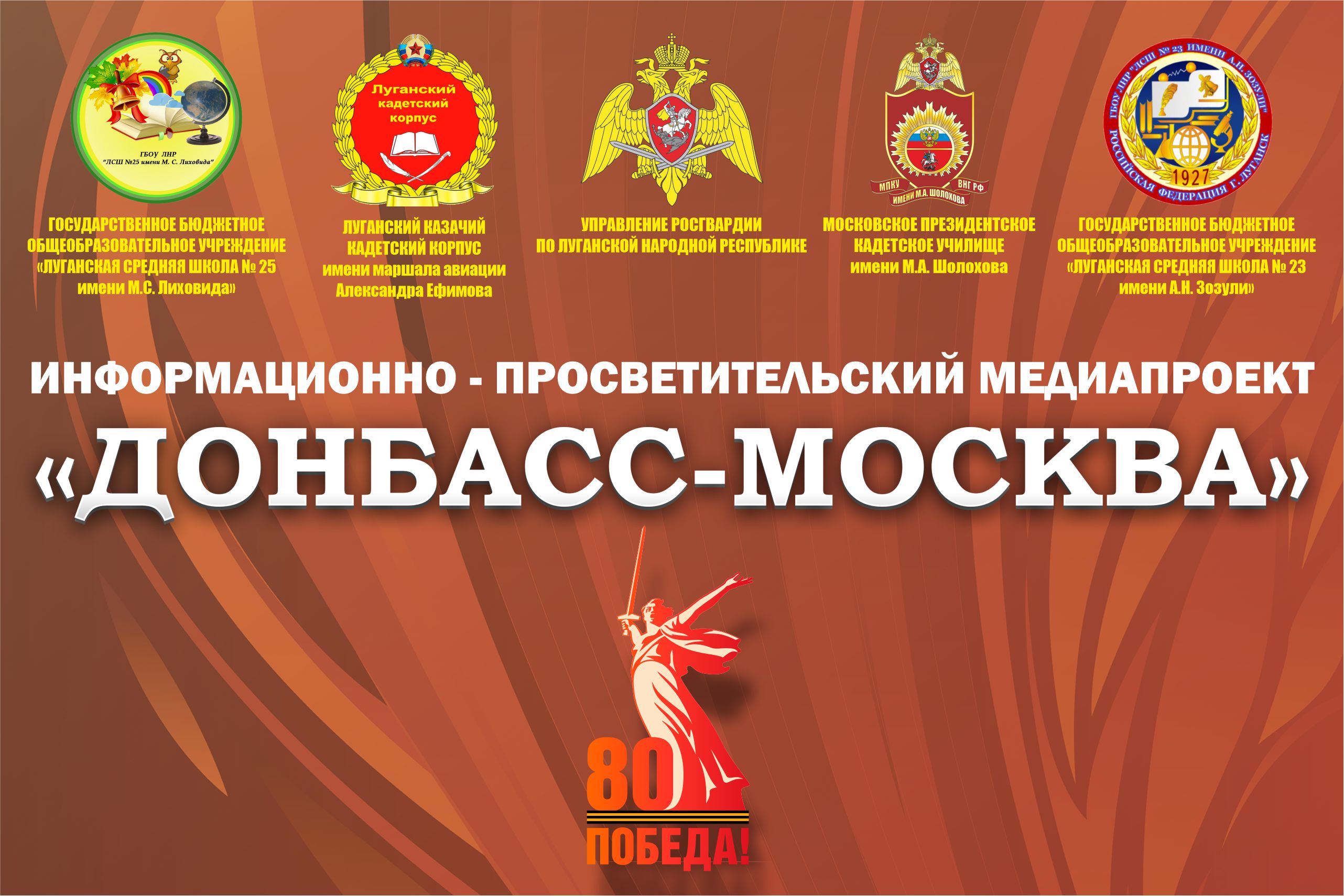 «ДОНБАСС-МОСКВА» – межрегиональный информационно-просветительский медиапроект направленный на реализацию положений Указа Президента Российской Федерации от 8.05.2024 г. № 314 «Об утверждении Основ государственной политики Российской Федерации в области исторического просвещения». Проект представляет собой комплекс мероприятий в форме занятий по военной истории с учащимися образовательных учреждений Луганской Народной Республики и Московского Президентского кадетского училища имени Шолохова М.А. войск национальной гвардии Российской Федерации, посвященных дням воинской славы России, отражающим события Великой Отечественной войны 1941-1945 гг. Проведен в два этапа (с 23 августа 2024 года по 5 декабря 2024 года и с 27 января 2025 года по 8 мая 2025 года), очно и в режиме видеоконференцсвязи.