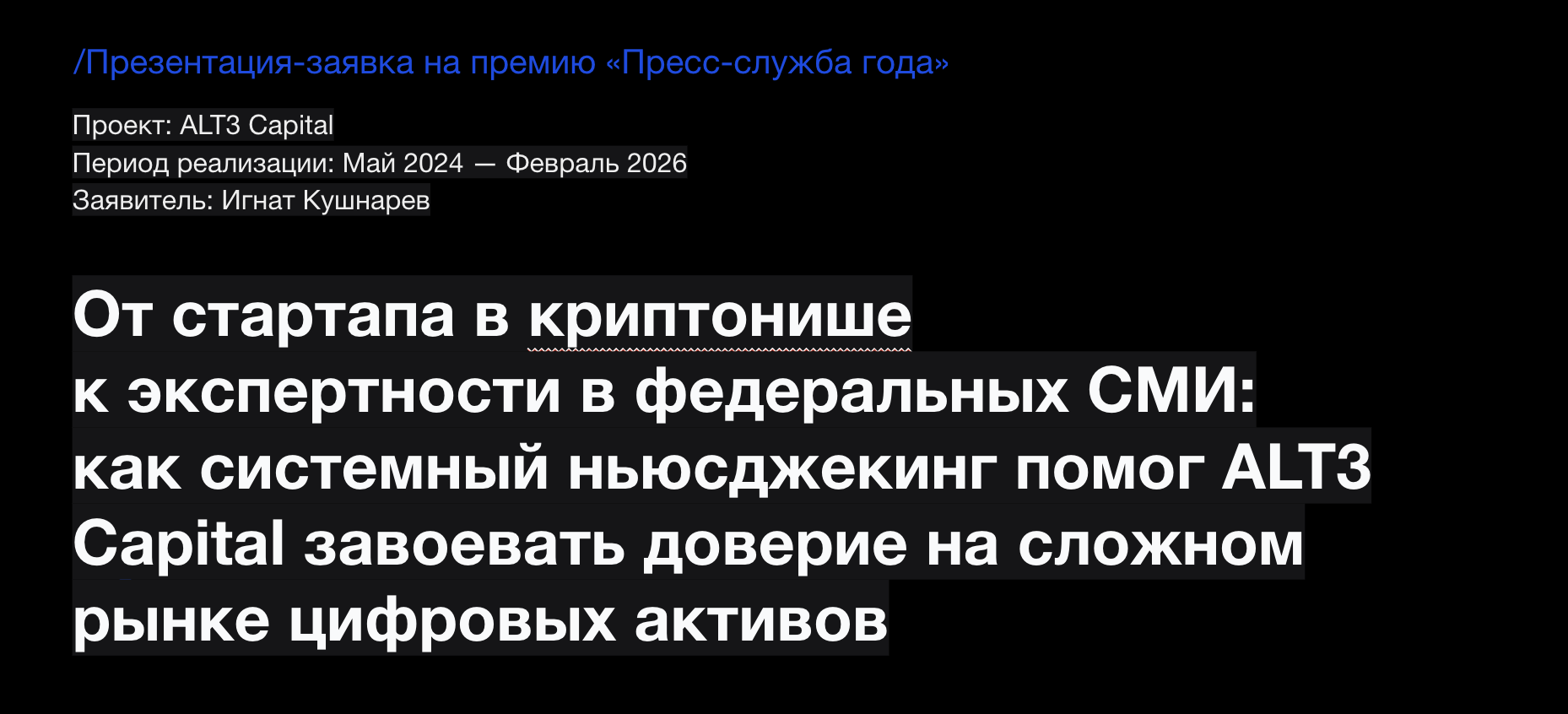 Легитимизация компании и закрепление экспертного статуса ALT3 Capital на рынке цифровых активов в ведущих деловых и федеральных СМИ России, преодоление стереотипного восприятия крипто-стартапа и формирование доверия консервативной финансовой аудитории.