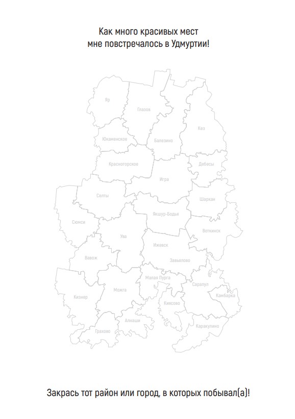 – Альбом для поездок «Истории о путешествии по Удмуртии: книга воспоминаний» – брошюра с маршрутами и полезной информацией по республике, куда можно вклеить фото, билеты и вписать впечатления о поездке. Её получателями стали партнёры и друзья республики.