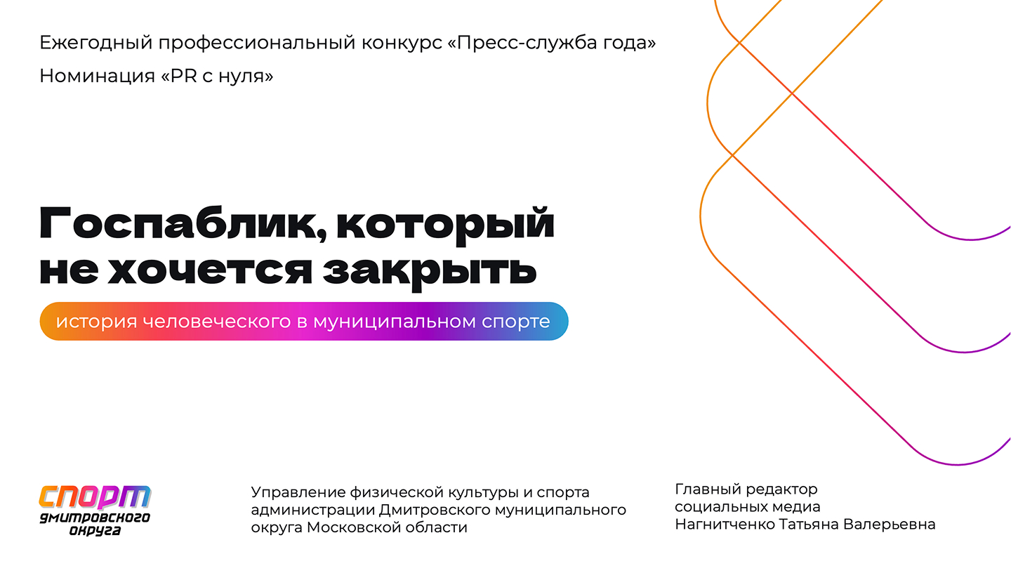 Проект «Госпаблик, который не хочется закрыть: история человеческого в муниципальном спорте» - это история о том, как за пять месяцев превратить отсутствие госпабликов в работающую систему коммуникаций, которая реально нужна людям. Мы не просто завели каналы в ВК и Telegram, а создали живую среду, где спорт в Дмитрове перестал быть «зоной официальных отчётов». Главная идея: новости делают те, кто внутри спорта — тренеры, методисты, администраторы из 20+ спортшкол, а главный редактор перерабатывает это в понятный, тёплый и полезный контент. Никакой воды, только то, что помогает родителям выбрать секцию, болельщикам — быть в курсе, а спортсменам — чувствовать себя звёздами. И всё это без рекламного бюджета, только на энтузиазме, партнёрствах и уважении к аудитории.Цель проекта