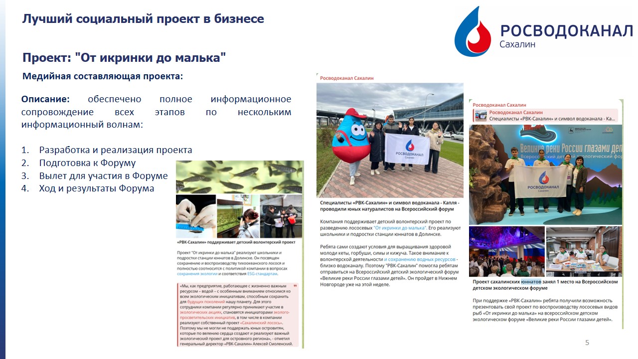 «РВК-Сахалин» профинансировал поездку команды юннатов на Всероссийский экологический фестиваль «Великие реки России глазами детей». Благодаря возможности очного участия и качеству своего проекта команда сахалинских юннатов заняла на нем первое место.