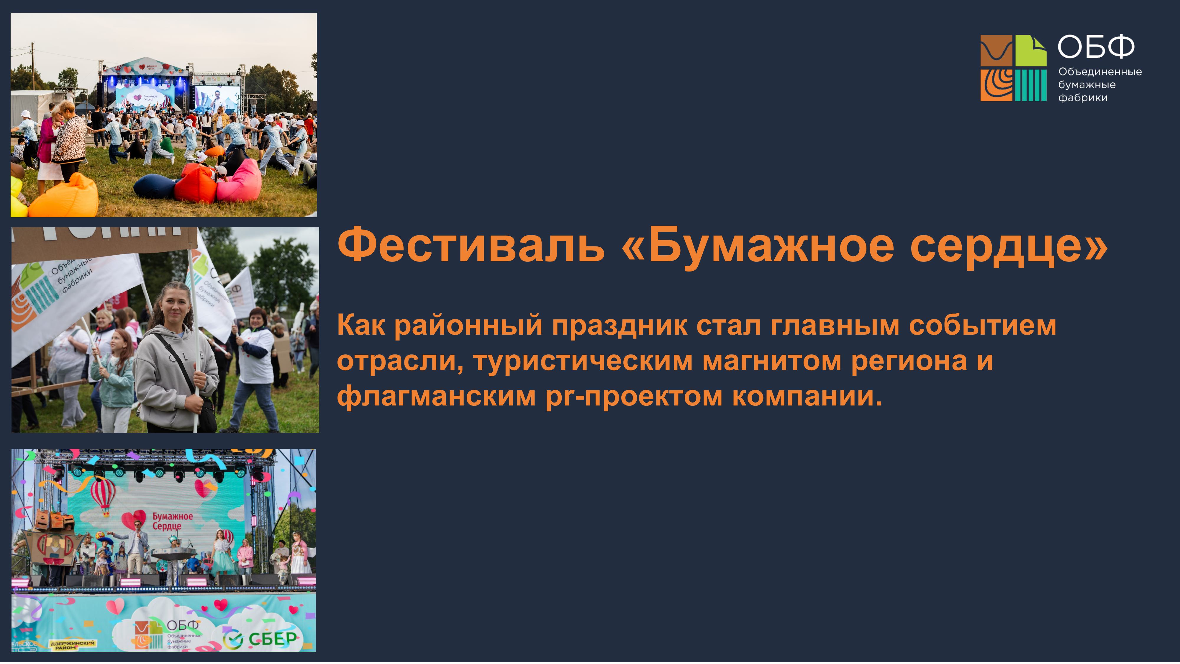Таким образом, фестиваль «Бумажное сердце» является флагманским PR-проектом Компании ОБФ. Он работает на имидж компании как лидера, объединяющего профессиональное сообщество, вносит вклад в развитие региона и формирует долгосрочную лояльность к отрасли у широкой аудитории, решая стратегические задачи кадрового и репутационного характера.