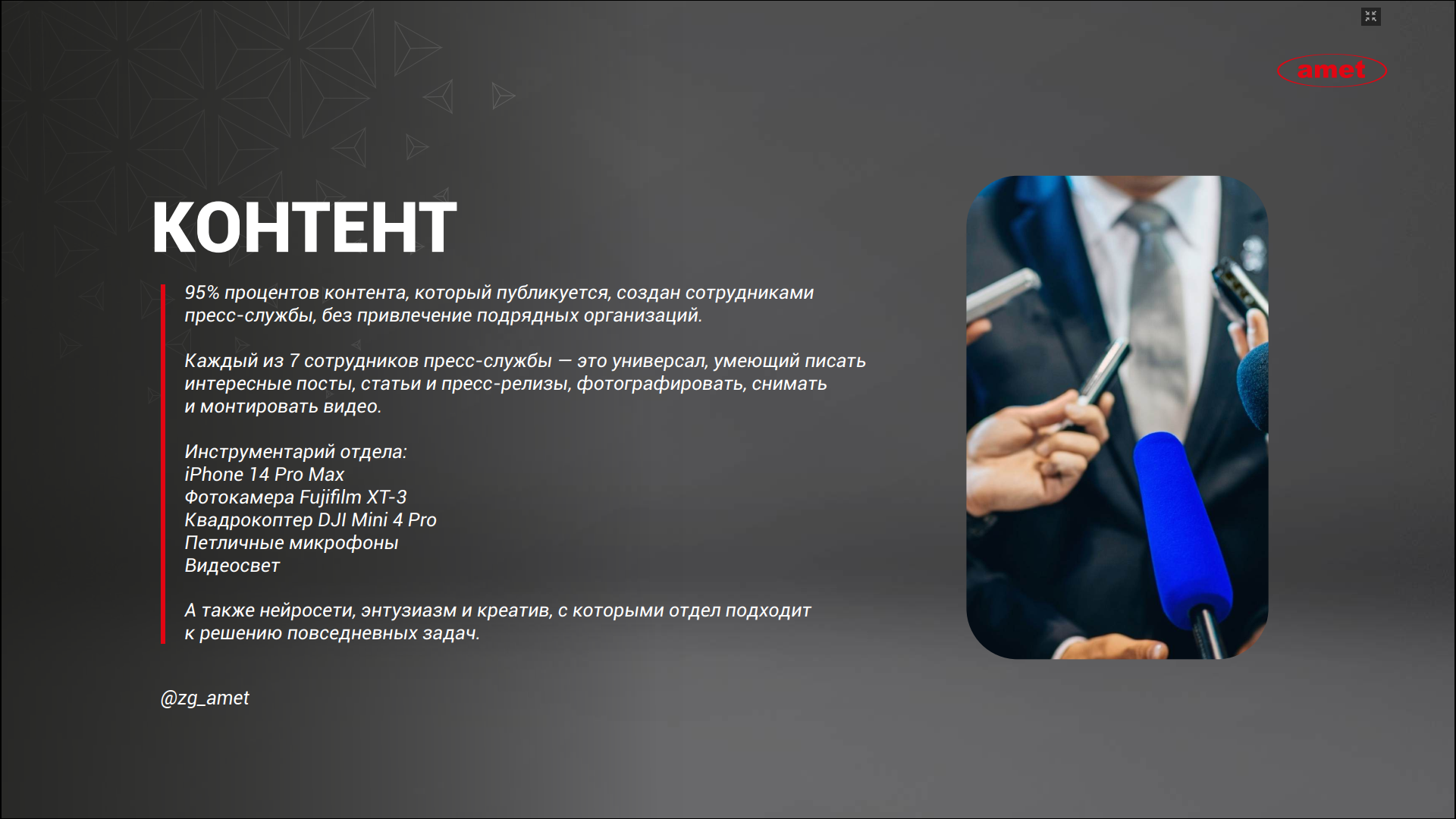 -сформирована и выведена на высокий уровень эффективности новая команда пресс-службы: все каналы коммуникации и контент создаются собственными силами без дополнительного бюджета (за исключением печати корпоративной газеты).