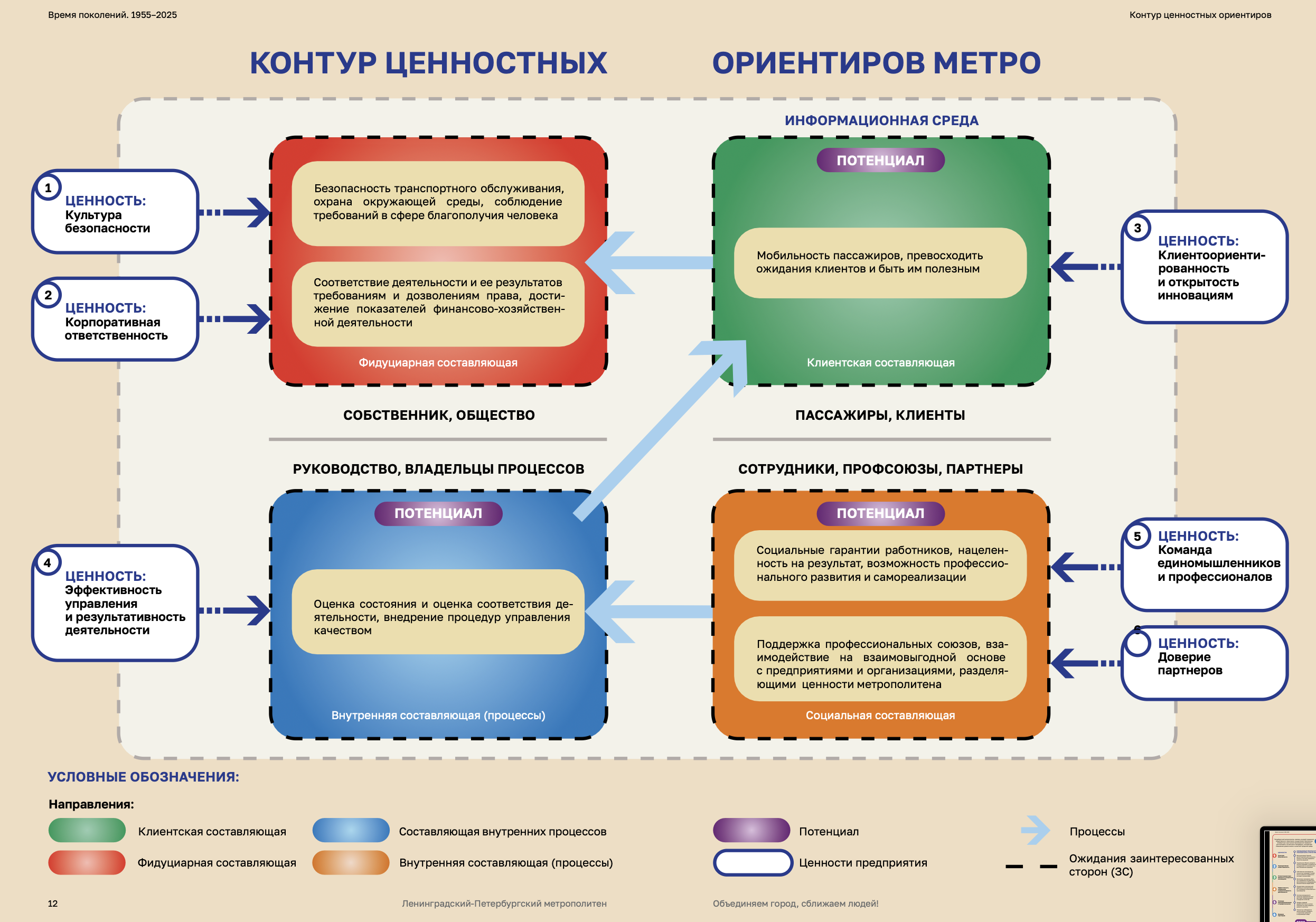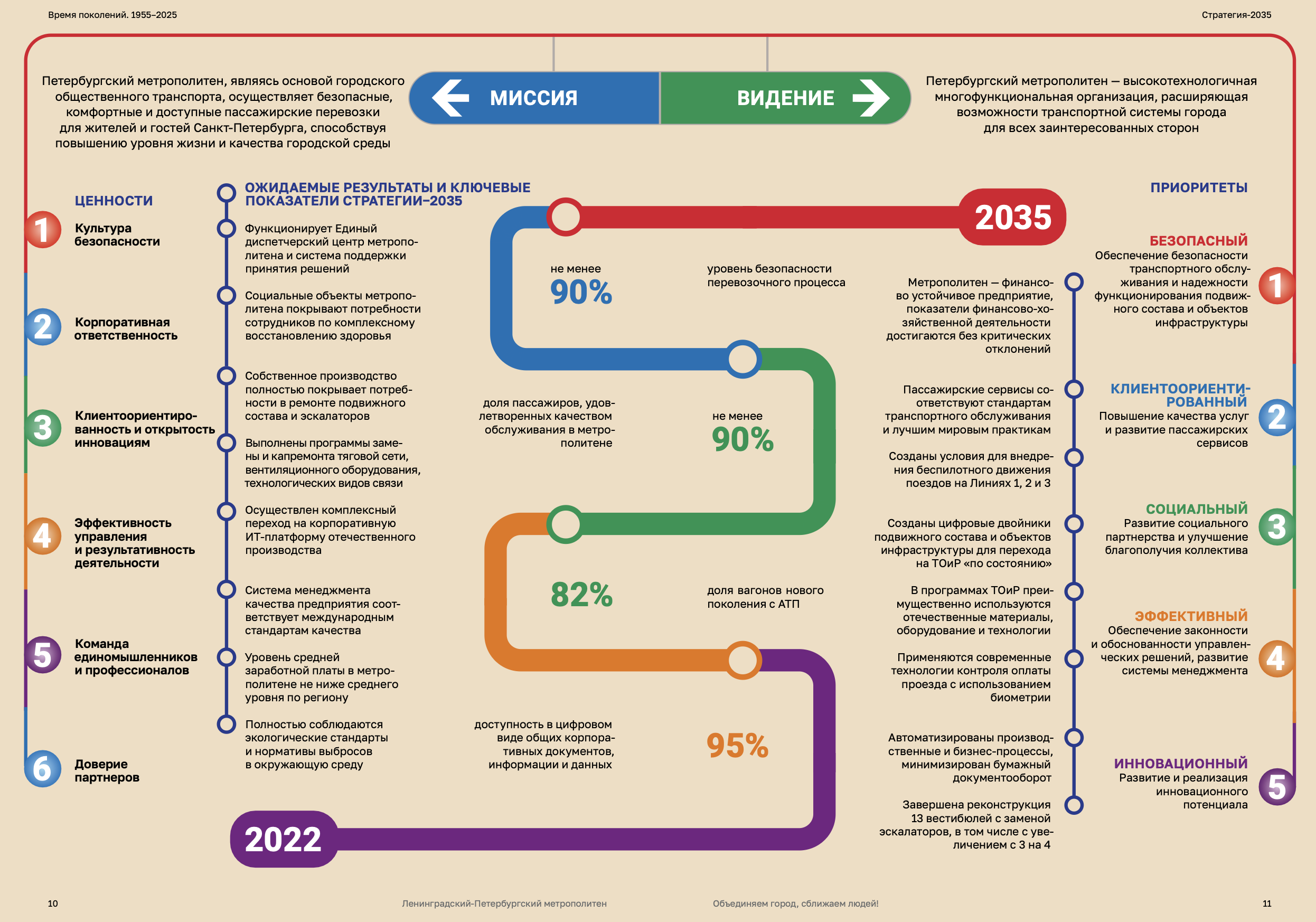 Раскрыть «Стратегию развития Предприятия» — включая контур ценностных ориентиров и пять приоритетов Петербургского метрополитена — для сотрудников метро из всех служб и отделов. Издание альбома «Время поколений» приурочено к 70-летию метро, прошедшему 15 ноября 2025 года.Результат проекта
