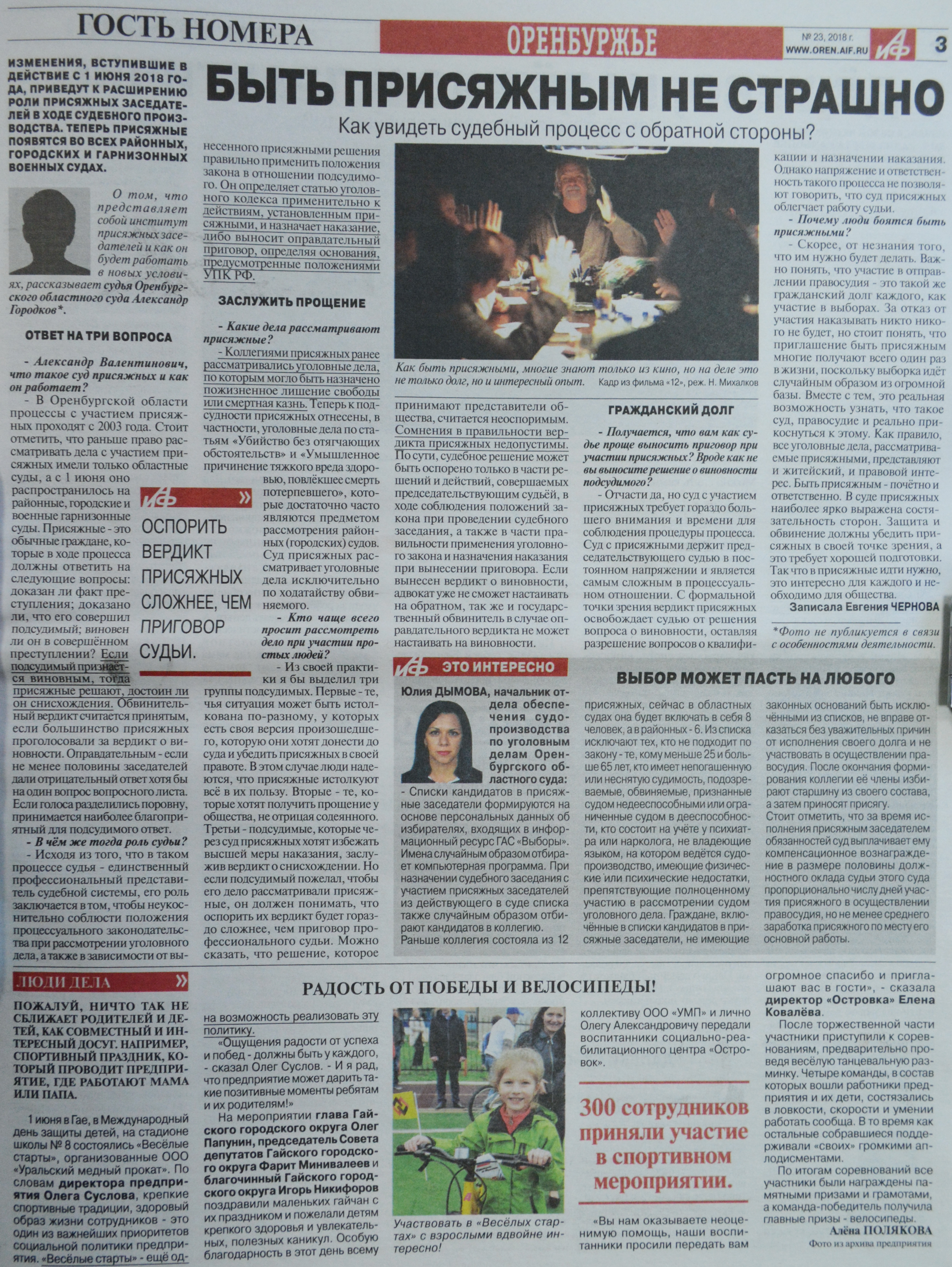С 1 июня 2018 года присяжные заседатели стали принимать участие в работе районных, городских, гарнизонных военных судов России.Задача объединенной пресс-службы судов общей юрисдикции и управления Судебного департамента в Оренбургской области в широком охвате аудитории при освещении данной темы в областных и районных печатных, электронных СМИ, донесения идеи, что исполнение обязанностей присяжного – гражданский долг для каждого из нас.